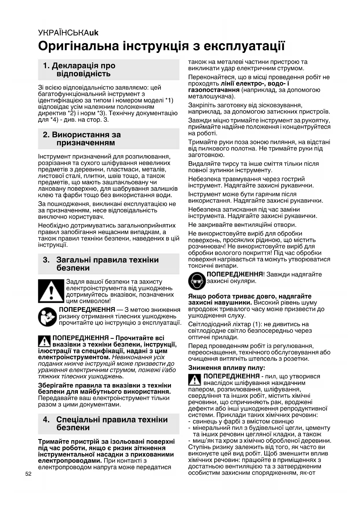 Оригінальна інструкція з експлуатації Зі всією відповідальністю заявляємо: цей багатофункціональний інструмент з ідентифікацією за типом і номером моделі *1) відповідає усім належним положенням директив *2) і норм *3). Технічну документацію для *4) - див. на стор. 3. Інструмент призначений для розпилювання, розрізання та сухого шліфування невеликих предметів з деревини, пластмаси, металів, листової сталі, плитки, швів тощо, а також предметів, що мають зашпакльовану чи лаковану поверхню, для шабрування залишків клею та фарби тощо без використання води. За пошкодження, викликані експлуатацією не за призначенням, несе відповідальність виключно користувач. Необхідно дотримуватись загальноприйнятих правил запобігання нещасним випадкам, а також правил техніки безпеки, наведених в цій інструкції. Задля вашої безпеки та захисту електроінструмента від ушкоджень дотримуйтесь вказівок, позначених цим символом! ПОПЕРЕДЖЕННЯ — З метою зниження ризику отримання тілесних ушкоджень прочитайте цю інструкцію з експлуатації. ПОПЕРЕДЖЕННЯ – Прочитайте всі вказівки з техніки безпеки, інструкції, ілюстрації та специфікації, надані з цим електроінструментом. Невиконання усіх поданих нижче інструкцій може призвести до ураження електричним струмом, пожежі і/або тяжких тілесних ушкоджень.