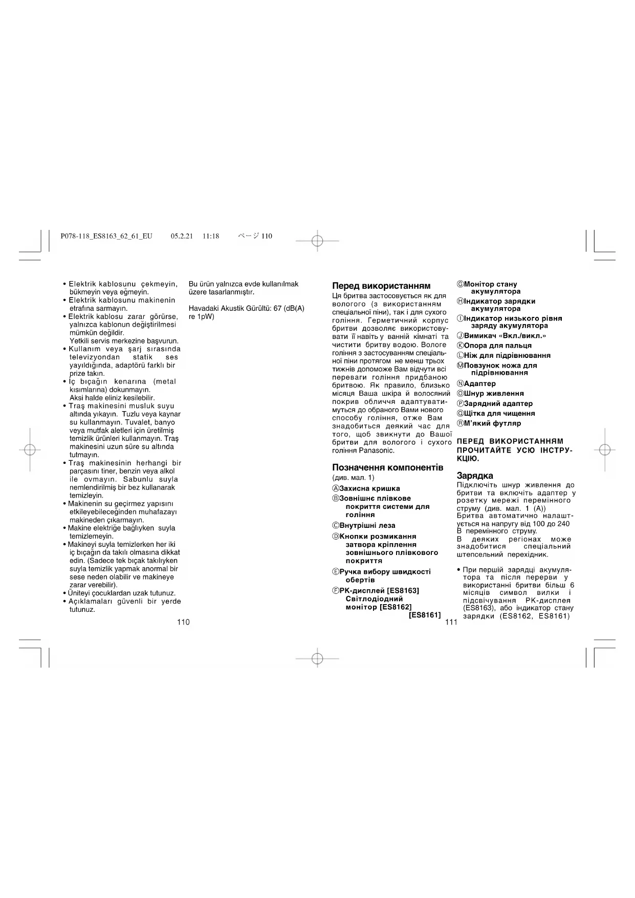 P078-118ES81636261EU 05.2.21 11:18 ページ 10893 Перед використанням Ця бритва застосовується як для вологого (з використанням спеціальної піни), так і для сухого гоління. Герметичний корпус бритви дозволяє використову- вати її навіть у ванній кімнаті та чистити бритву водою. Вологе гоління з застосуванням спеціаль- ної піни протягом не менш трьох тижнів допоможе Вам відчути всі переваги гоління придбаною бритвою. Як правило, близько місяця Ваша шкіра й волосяний покрив обличчя адаптувати- муться до обраного Вами нового способу гоління, отже Вам знадобиться деякий час для того, щоб звикнути до Вашої бритви для вологого і сухого гоління Panasonic. Позначення компонентів (див. мал. 1) A Захисна кришка B Зовнішнє плівкове покриття системи для