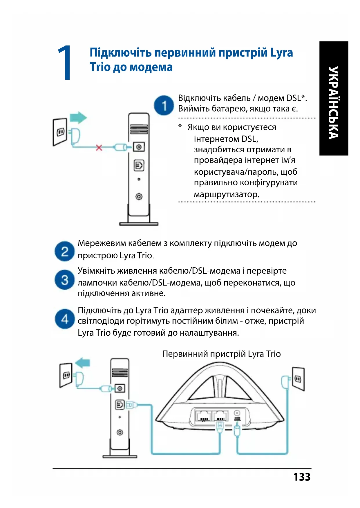 Підключіть до Lyra Trio адаптер живлення і почекайте, доки світлодіоди горітимуть постійним білим - отже, пристрій Lyra Trio буде готовий до налаштування. LAN Первинний пристрій Lyra Trio134