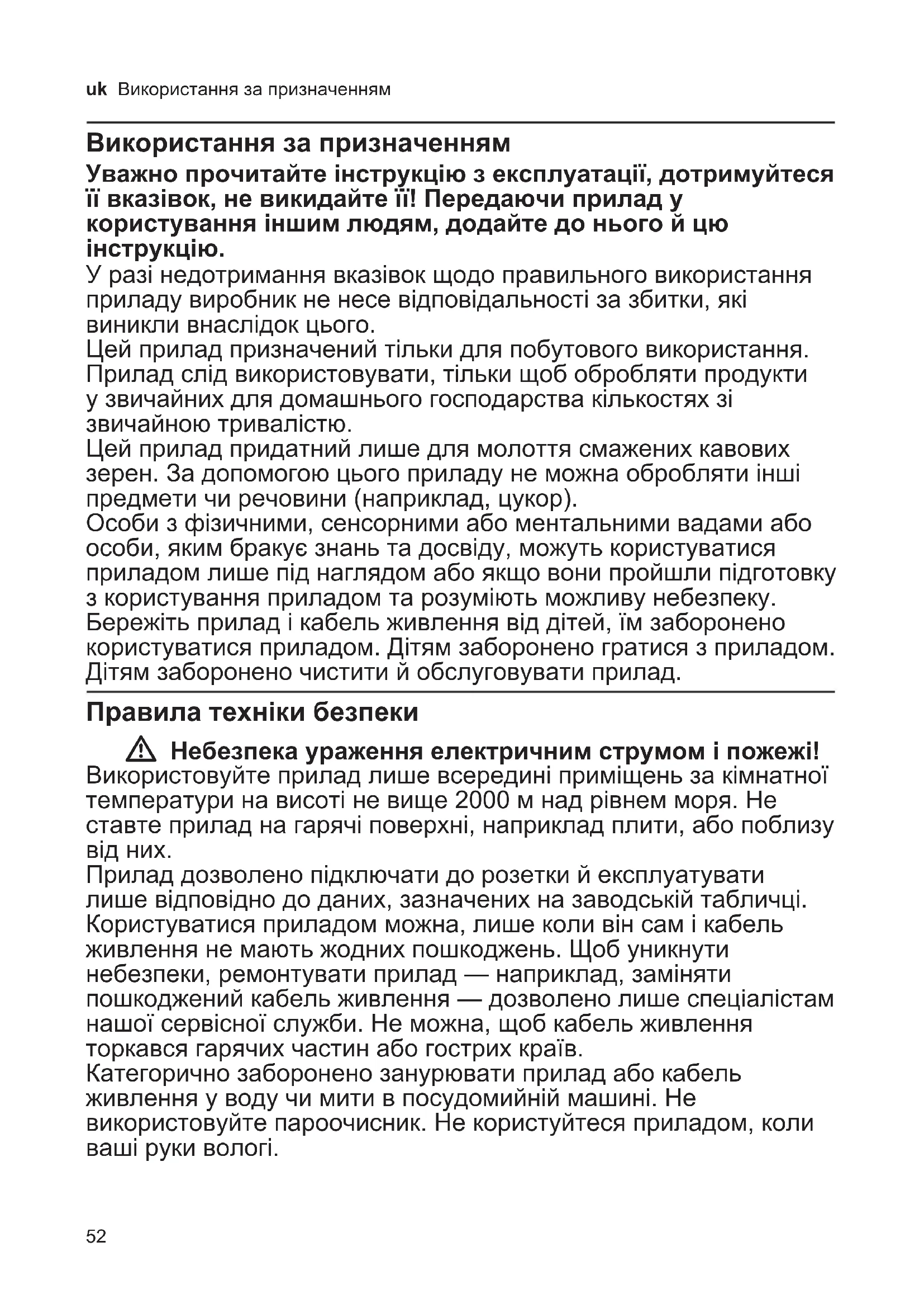 garanciális szolgáltatásokat a vásárlásnál kapott, szabályosan kitöltött garanciajeggyel lehet igénybevenni, amely minden egyéb garanciális feltételt is részletesen ismertet. Minőségtanúsítás: A 2/1984. (111.10) BkM-IpM számú rendelete alapján, mint forgalmazó tanúsítjuk, hogy a készülék a vásárlási tájékoztatóban közölt adatoknak megfelel. A változtatások jogát fenntartjuk.52 uk Використання за призначенням Використання за призначенням Уважно прочитайте інструкцію з експлуатації, дотримуйтеся її вказівок, не викидайте її! Передаючи прилад у користування іншим людям, додайте до нього й цю інструкцію. У разі недотримання вказівок щодо правильного використання приладу виробник не несе відповідальності за збитки, які виникли внаслідок цього. Цей прилад призначений тільки для побутового використання. Прилад слід використовувати, тільки щоб обробляти продукти у звичайних для домашнього господарства кількостях зі звичайною тривалістю. Цей прилад придатний лише для молоття смажених кавових зерен. За допомогою цього приладу не можна обробляти інші предмети чи речовини (наприклад, цукор). Особи з фізичними, сенсорними або ментальними вадами або особи, яким бракує знань та досвіду, можуть користуватися приладом лише під наглядом або якщо вони пройшли підготовку з користування приладом та розуміють можливу небезпеку. Бережіть прилад і кабель живлення від дітей, їм заборонено користуватися приладом. Дітям заборонено гратися з приладом. Дітям заборонено чистити й обслуговувати прилад. Правила техніки безпеки W Небезпека ураження електричним струмом і пожежі! Використовуйте прилад лише всередині приміщень за кімнатної температури на висоті не вище 2000 м над рівнем моря. Не ставте прилад на гарячі поверхні, наприклад плити, або поблизу