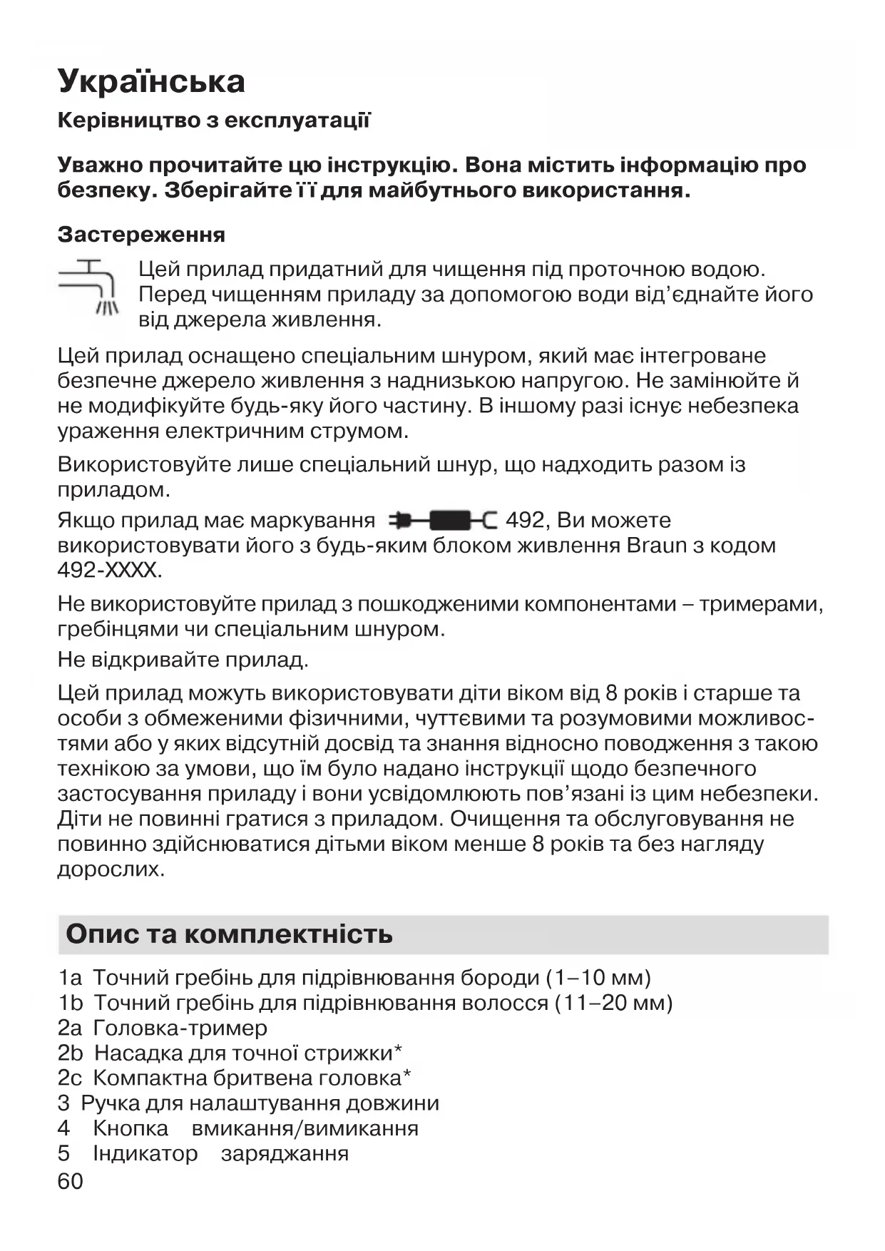 Якщо прилад має маркування 492, Ви можете використовувати його з будь-яким блоком живлення Braun з кодом 492-XXXX. Не використовуйте прилад з пошкодженими компонентами – тримерами, гребінцями чи спеціальним шнуром. Не відкривайте прилад. Цей прилад можуть використовувати діти віком від 8 років і старше та особи з обмеженими фізичними, чуттєвими та розумовими можливос- тями або у яких відсутній досвід та знання відносно поводження з такою технікою за умови, що їм було надано інструкції щодо безпечного застосування приладу і вони усвідомлюють пов’язані із цим небезпеки. Діти не повинні гратися з приладом. Очищення та обслуговування не повинно здійснюватися дітьми віком менше 8 років та без нагляду