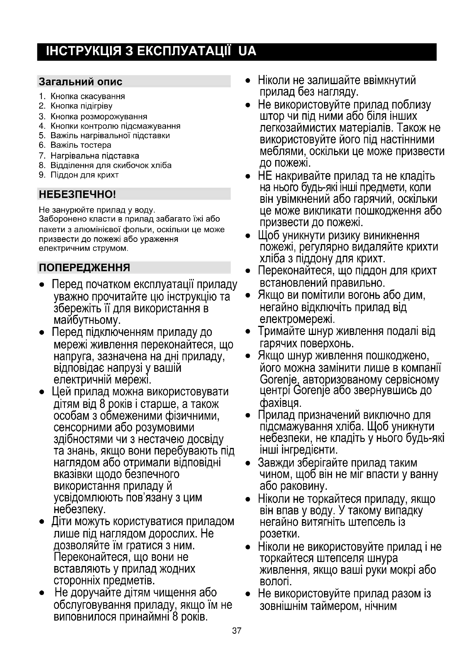 - Прилад призначений виключно для підсмажування хліба. Щоб уникнути небезпеки, не кладіть у нього будь-які інші інгредієнти.