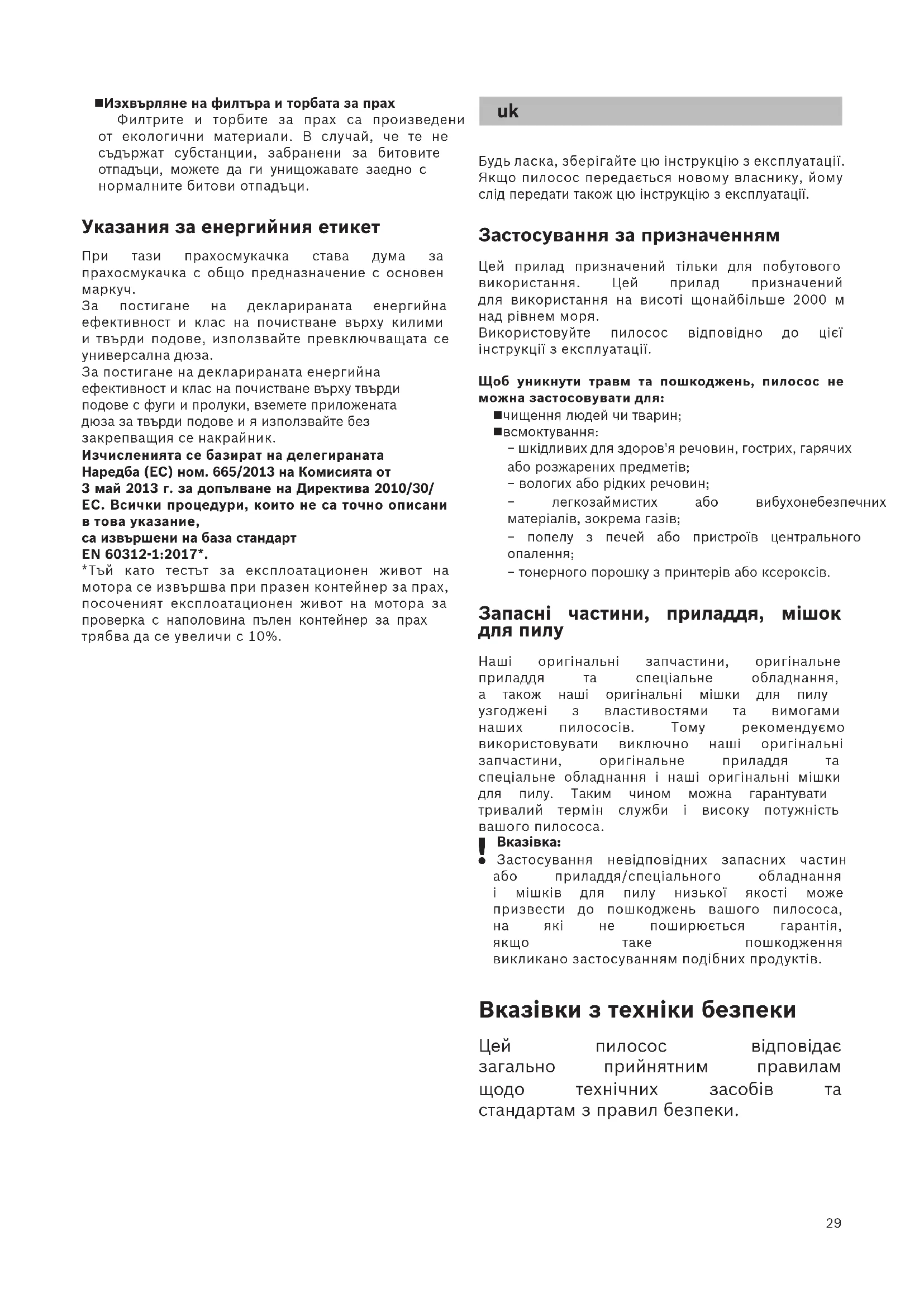 Застосування невідповідних запасних частин або приладдя/спеціального обладнання і мішків для пилу низької якості може призвести до пошкоджень вашого пилососа, на які не поширюється гарантія, якщо таке пошкодження викликано застосуванням подібних продуктів. Вказівки з техніки безпеки Цей пилосос відповідає загально прийнятним правилам щодо технічних засобів та стандартам з правил безпеки.30 Діти до 8 років, особи з фізичними чи розумовими вадами або особи, які не мають достатнього досвіду та знань, можуть користуватися приладом лише під наглядом або якщо вони навчені правильному користуванню пилососом та усвідомлюють можливі