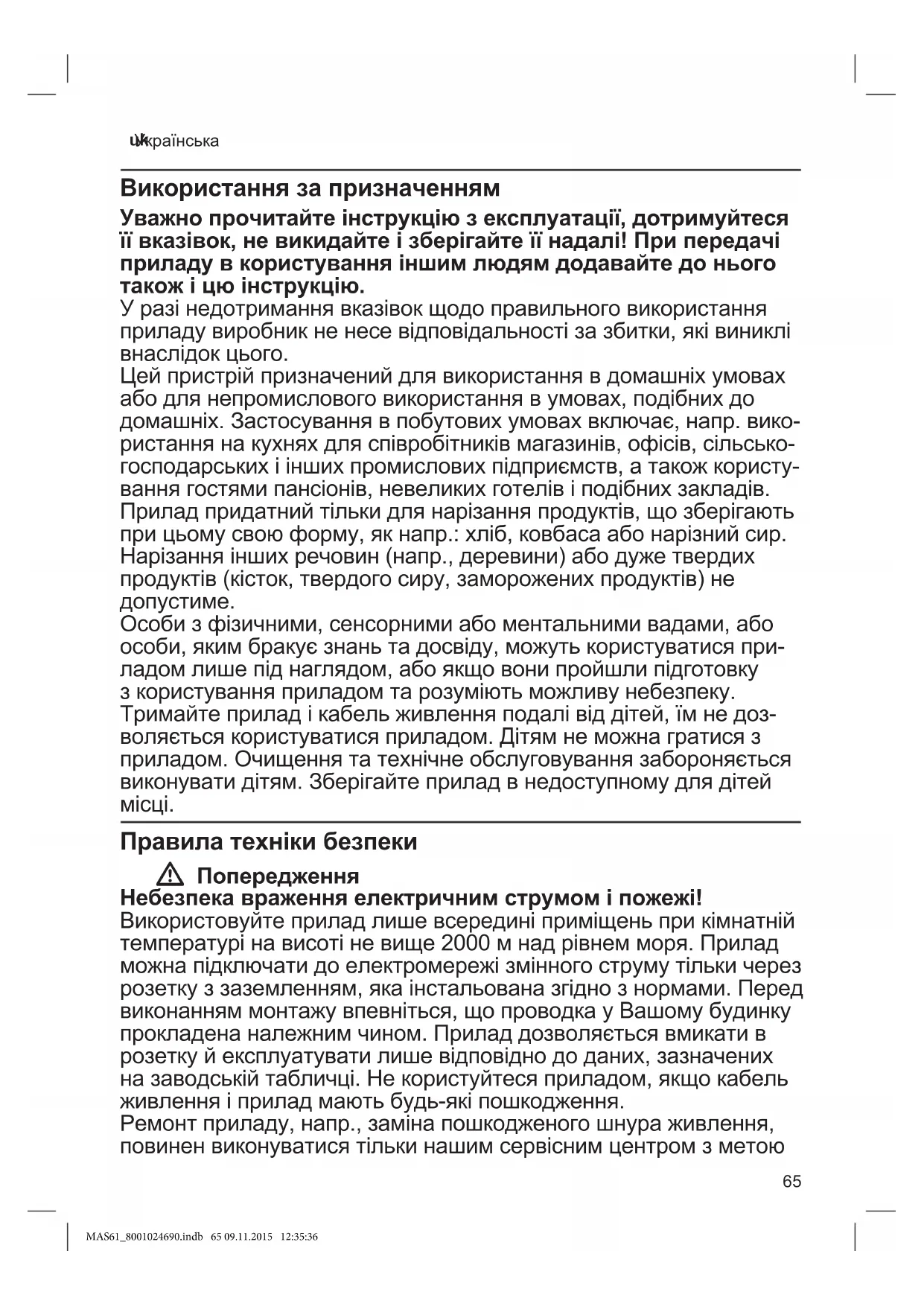 Кабельживленнянеповиненторкатисядогарячихчастинабо гострихкраїв.Ужодномуразінезанурюйтеприладуводуіне мийтейоговпосудомийніймашині!Некористуйтесяприладом порядзраковиною,заповненоюводою!Необслуговуйтеприлад вологимирукамитанеексплуатуйтейогонахолостомуходу. Приладнеобхіднопостійновимикатизмережіпередкожним використанням,завідсутностідогляду,передмонтажем,демон- тажемчичищеннямтауразінесправності.Передзаміною приладдяабокомплектуючихелементів,якірухаютьсяпідчас роботи,вирібслідвимкнутитавід’єднативіделектромережі. W Попередження Небезпека травмування Ніждужегострий.Ніколинетримайтерукипоблизуножа.Після вимкненняприводщедеякийчаспродовжуєрухатися.Поче- кайте,покиніжзупиниться!Післяроботивстановітьтовщину нарізкина«0».Цейпобутовийприладповиненвикористовува- тисязполозкамиіутримувачемдляпродуктівуробочомуполо- женні,завиняткомтихвипадків,коливеличинаіформапередба- ченогодлярізанняпродуктунедозволяєїхвикористання. Передочищеннямвитягнітьштепсельнувилкузрозеткита знімітьніж.Ніжнеберітьзаріжучуповерхню,атількизакрі- плення.Увипадкузбоюелектропостачанняприладзалишається ввімкнениміпісляцьогозновупочинаєпрацювати. W Увага! Двигунможеперегрітися!Післямакс.10хвилинбезперервної роботидайтеприладуохолонути. W Попередження Небезпека задушення Недозволяйтедітямгратисязпакувальнимматеріалом. MAS61_8001024690.indb 66 09.11.2015 12:35:36 67