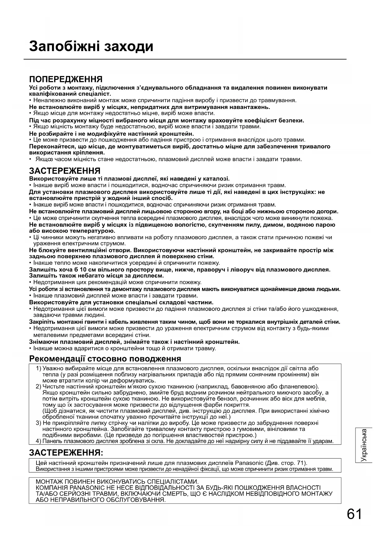 Панель плазмового дисплея зроблена зі скла. Не докладайте до неї надмірну силу й не піддавайте її ударам. ЗАСТЕРЕЖЕННЯ: Цей настінний кронштейн призначений лише для плазмових дисплеїв Panasonic (Див. стор. 71). Використання з іншими пристроями може призвести до ненадійної фіксації, що може спричинити ризик отримання травм. МОНТАЖ ПОВИНЕН ВИКОНУВАТИСЬ СПЕЦІАЛІСТАМИ. КОМПАНІЯ PANASONIC НЕ НЕСЕ ВІДПОВІДАЛЬНОСТІ ЗА БУДЬ-ЯКІ ПОШКОДЖЕННЯ ВЛАСНОСТІ ТА/АБО СЕРЙОЗНІ ТРАВМИ, ВКЛЮЧАЮЧИ СМЕРТЬ, ЩО Є НАСЛІДКОМ НЕВІДПОВІДНОГО МОНТАЖУ АБО НЕПРАВИЛЬНОГО ОБСЛУГОВУВАННЯ. Запобіжні заходи62