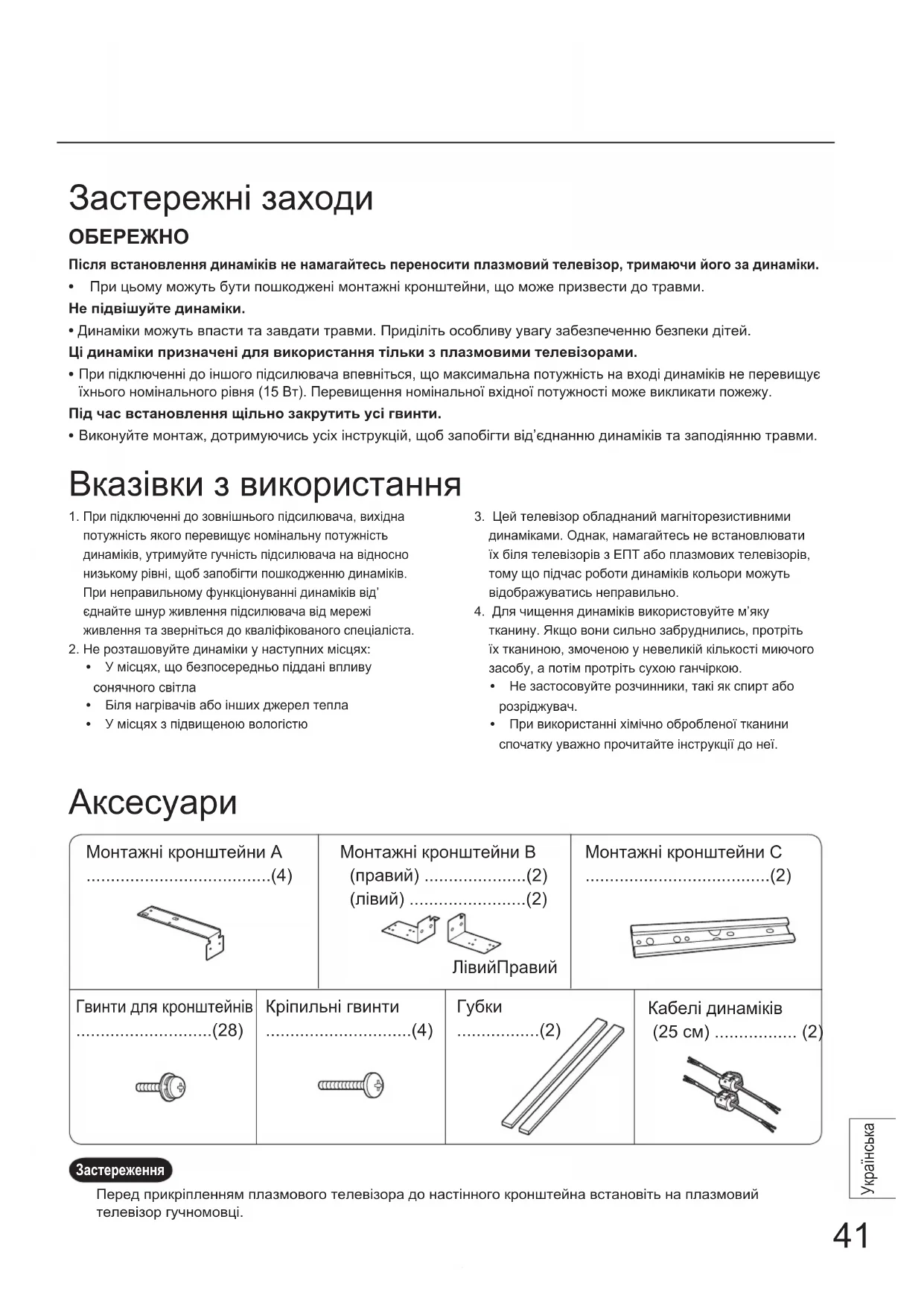При підключенні до зовнішнього підсилювача, вихідна потужність якого перевищує номінальну потужність динаміків, утримуйте гучність підсилювача на відносно низькому рівні, щоб запобігти пошкодженню динаміків. При неправильному функціонуванні динаміків від’єднайте шнур живлення підсилювача від мережі живлення та зверніться до кваліфікованого спеціаліста.2. Не розташовуйте динаміки у наступних місцях:• У місцях, що безпосередньо піддані впливу сонячного світла• Біля нагрівачів або інших джерел тепла• У місцях з підвищеною вологістю3. Цей телевізор обладнаний магніторезистивними динаміками. Однак, намагайтесь не встановлювати їх біля телевізорів з ЕПТ або плазмових телевізорів, тому що підчас роботи динаміків кольори можуть відображуватись неправильно.4. Для чищення динаміків використовуйте м’яку тканину. Якщо вони сильно забруднились, протріть їх тканиною, змоченою у невеликій кількості миючого засобу, а потім протріть сухою ганчіркою.• Не застосовуйте розчинники, такі як спирт або розріджувач.• При використанні хімічно обробленої тканини спочатку уважно прочитайте інструкції до неї. Вказівки з використання Монтажні кронштейни А ......................................(4) Монтажні кронштейни B (правий) .....................(2) (лівий) ........................(2) Гвинти для кронштейнів ............................(28)