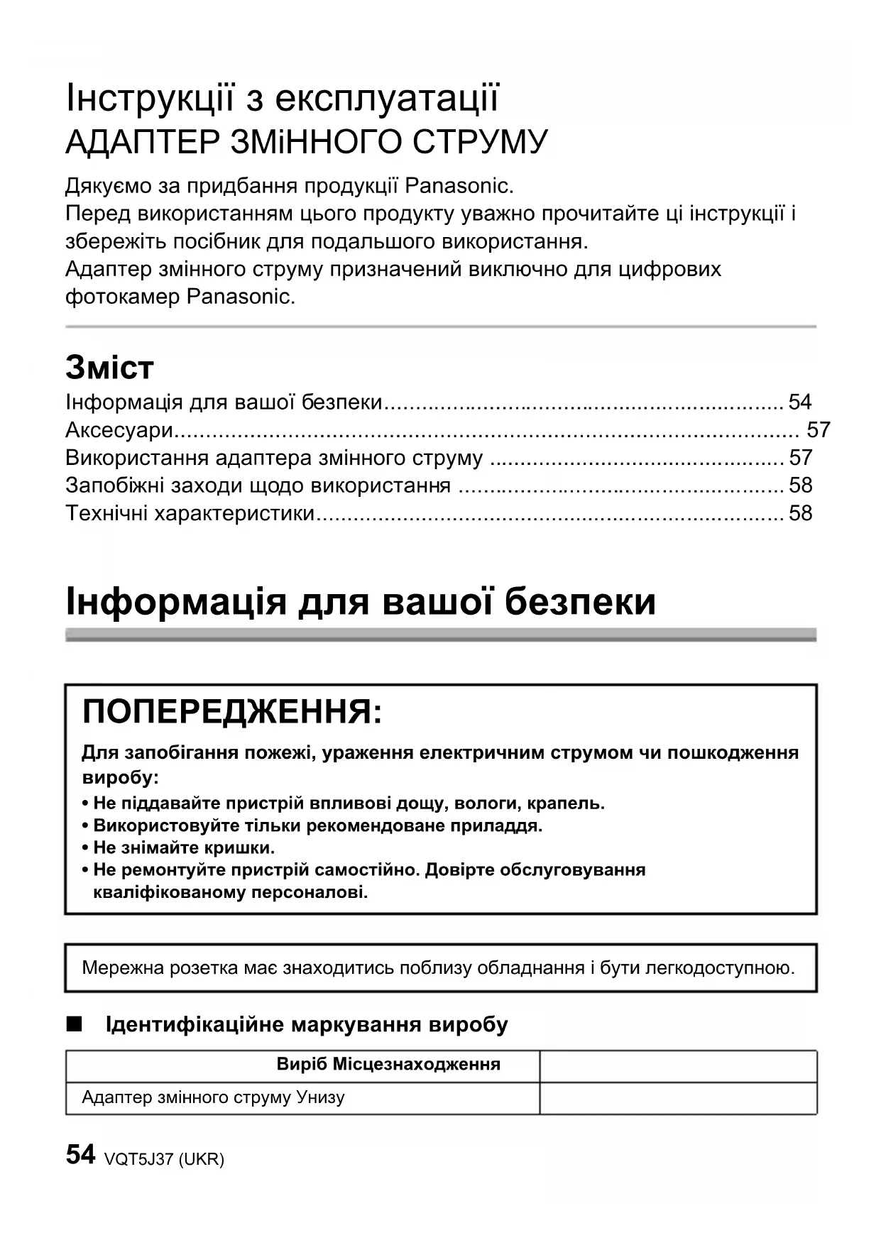 Інструкції з експлуатації АДАПТЕР ЗМіННОГО СТРУМУ Дякуємо за придбання продукції Panasonic. Перед використанням цього продукту уважно прочитайте ці інструкції і збережіть посібник для подальшого використання. Адаптер змінного струму призначений виключно для цифрових фотокамер Panasonic.