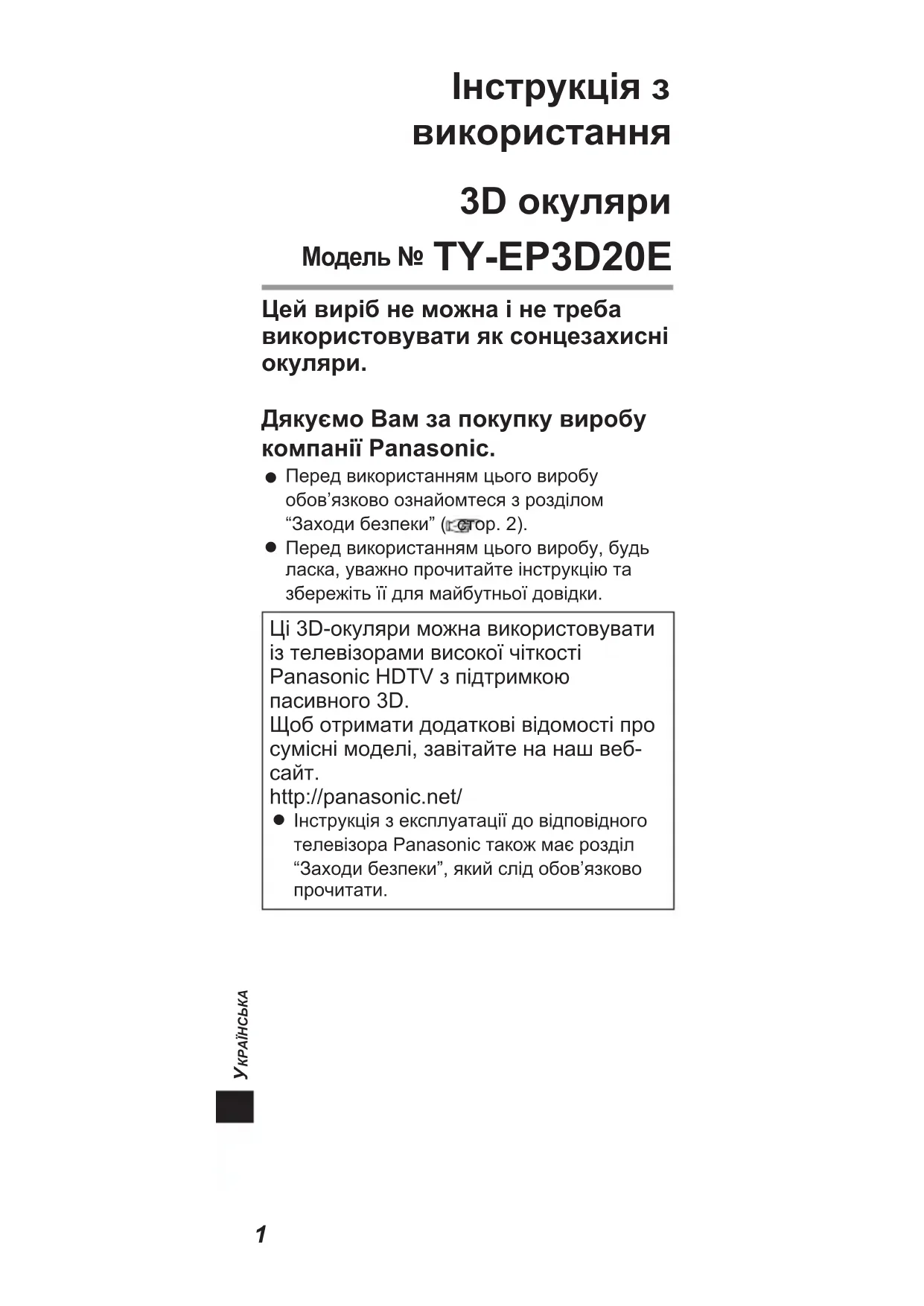Дякуємо Вам за покупку виробу компанії Panasonic. Перед використанням цього виробу обов’язково ознайомтеся з розділом “Заходи безпеки” ( стор. 2). Перед використанням цього виробу, будь ласка, уважно прочитайте інструкцію та збережіть її для майбутньої довідки. Ці 3D-окуляри можна використовувати із телевізорами високої чіткості Panasonic HDTV з підтримкою пасивного 3D. Щоб отримати додаткові відомості про сумісні моделі, завітайте на наш веб-