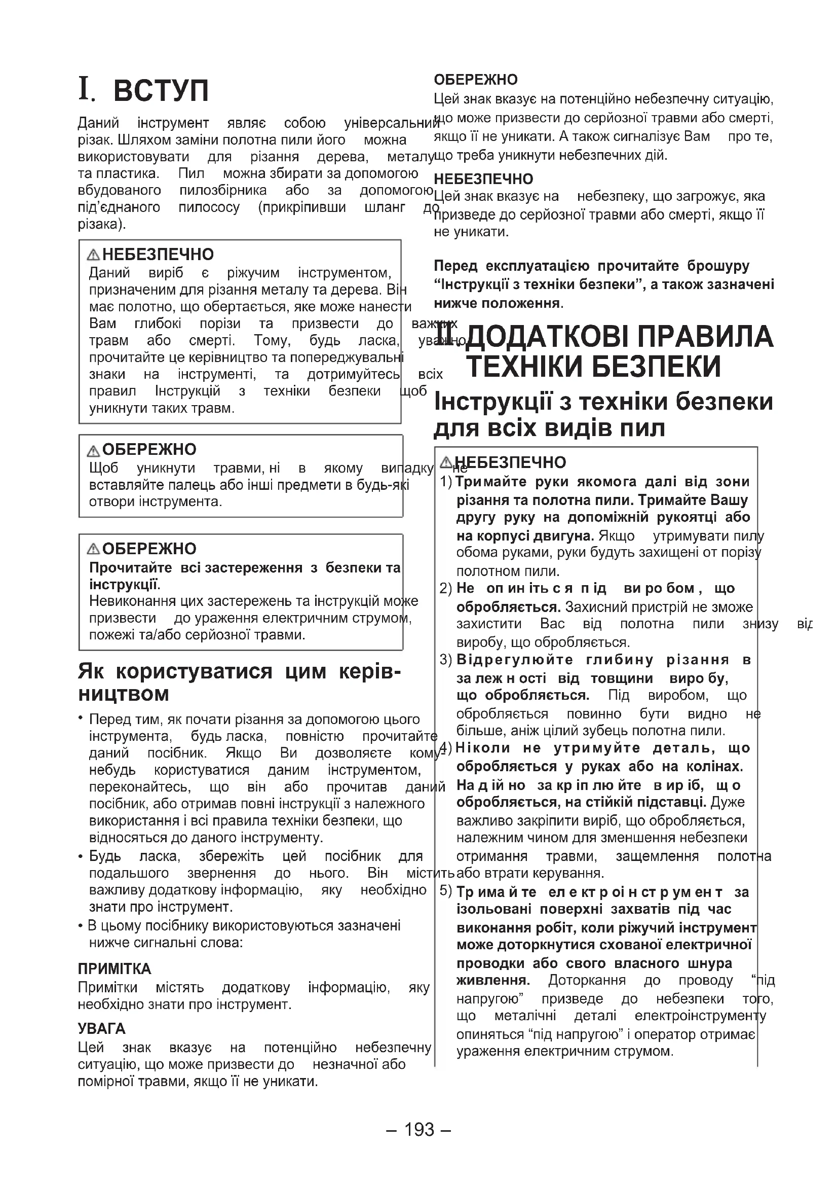 Передтим,якпочатирізаннязадопомогоюцьогоінструмента, будьласка, повністю прочитайтеданий посібник. Якщо Ви дозволяєте кому-небудь користуватися даним інструментом,переконайтесь, що він або прочитав данийпосібник,абоотримавповніінструкціїзналежноговикористанняівсіправилатехнікибезпеки,щовідносятьсядоданогоінструменту. Будь ласка, збережіть цей посібник дляподальшого звернення до нього. Він міститьважливудодатковуінформацію, яку необхіднознатипроінструмент. Вцьомупосiбникувикористовуютьсязазначенiнижчесигнальніслова:ПРИМІТКАПримітки містять додаткову інформацію, якунеобхіднознатипроінструмент.УВАГАЦей знак вказує на потенційно небезпечнуситуацію,щоможепризвестидо незначноїабопомірноїтравми,якщоїїнеуникати.ОБЕРЕЖНОЦейзнаквказуєнапотенційнонебезпечнуситуацію,щоможепризвестидосерйозноїтравмиабосмерті,якщоїїнеуникати.АтакожсигналізуєВам проте,щотребауникнутинебезпечнихдiй.НЕБЕЗПЕЧНОЦейзнаквказуєна небезпеку,щозагрожує,якапризведедосерйозноїтравмиабосмерті,якщоїїнеуникати.Перед експлуатацією прочитайте брошуру “Iнструкції з техніки безпеки”, а також зазначенi нижче положення.