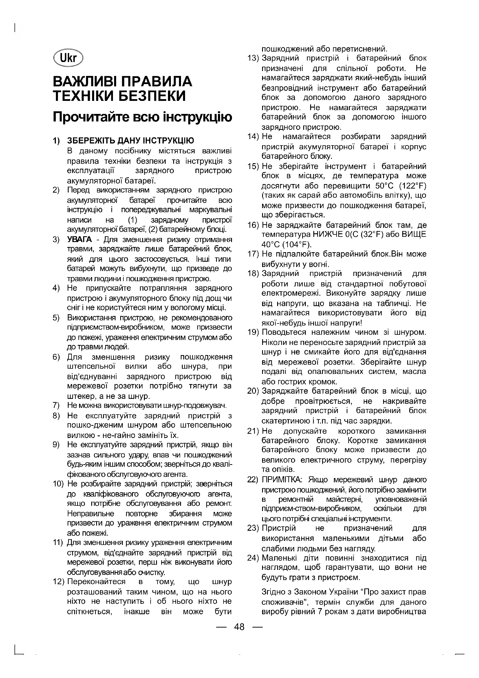 В даному посібнику містяться важливі правила техніки безпеки та інструкція з експлуатації зарядного пристрою акумуляторної батареї.