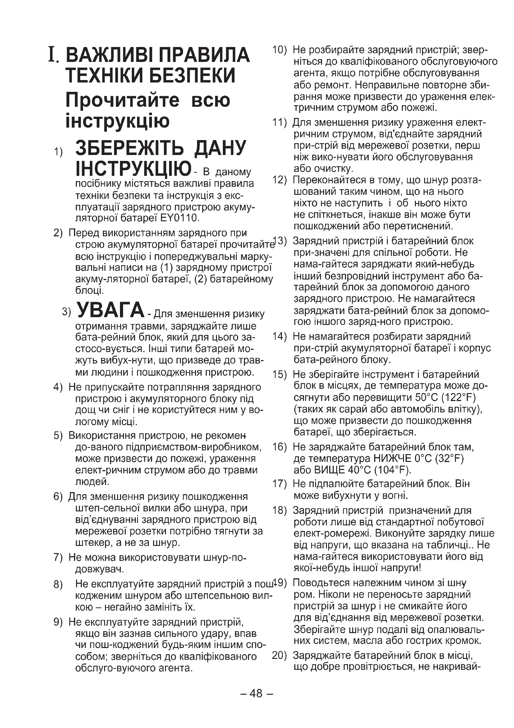 посібнику містяться важливі правила техніки безпеки та інструкція з екс- плуатації зарядного пристрою акуму- ляторної батареї EY0110.
