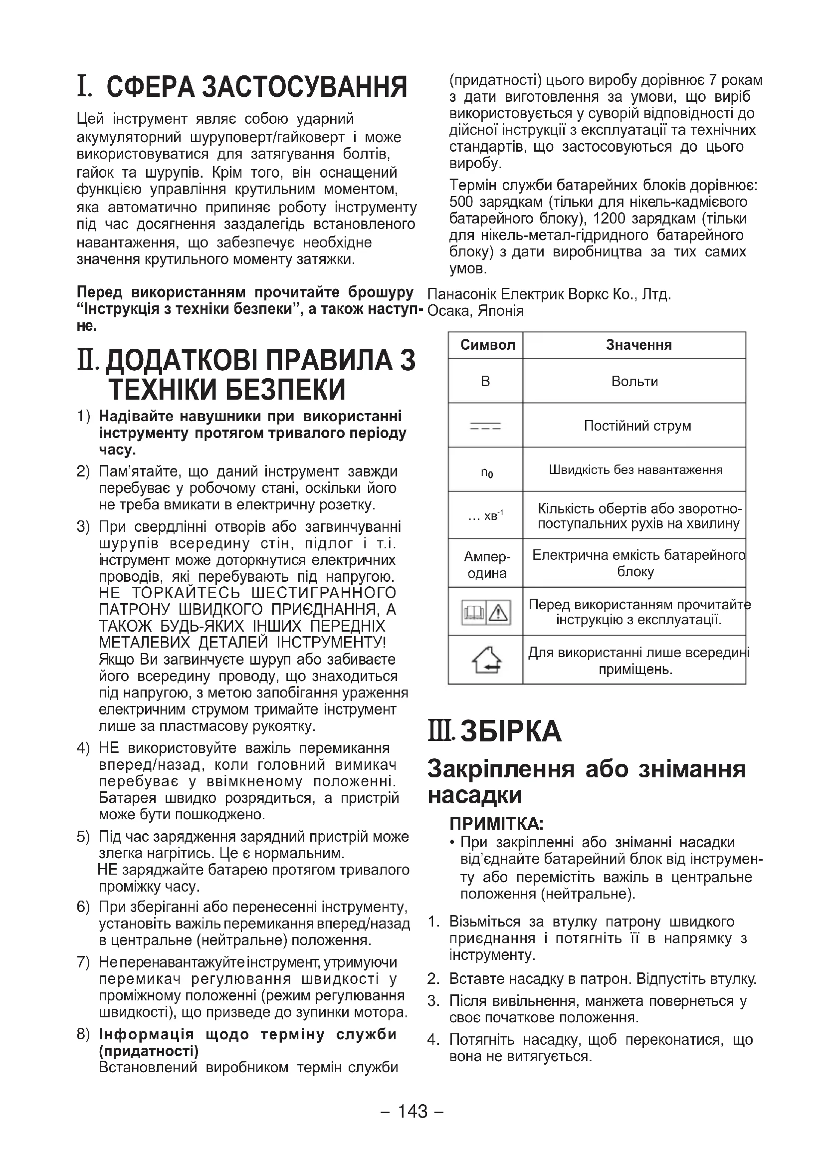 Інформація щодо терміну служби (придатності)Встановлений виробником термін служби (придатності) цього виробу дорівнює 7 рокам з дати виготовлення за умови, що виріб використовується у суворій відповідності до дійсної інструкції з експлуатації та технічних стандартів, що застосовуються до цього виробу.Термін служби батарейних блоків дорівнює: 500 зарядкам (тільки для нікель-кадмієвого батарейного блоку), 1200 зарядкам (тільки для нікель-метал-гідридного батарейного блоку) з дати виробництва за тих самих умов.Панасонiк Електрик Воркс Ко., Лтд.Осака, ЯпоніяСимвол Значення ВольтиПостійний струм