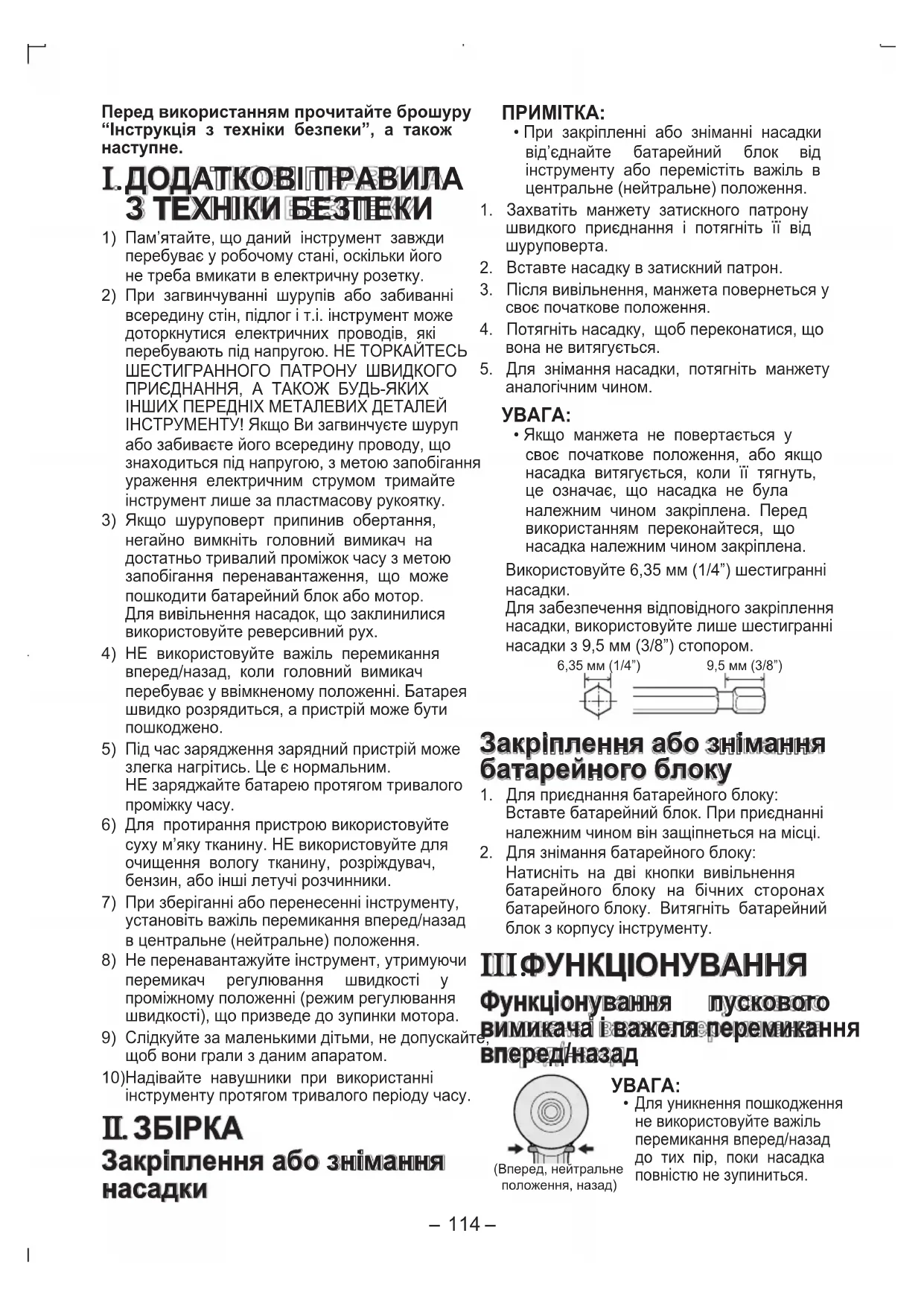- Якщо манжета не повертається у своє початкове положення, або якщо насадка витягується, коли її тягнуть, це означає, що насадка не була належним чином закріплена. Перед використанням переконайтеся, що насадка належним чином закріплена.Використовуйте 6,35 мм (1/4”) шестигранні насадки.Для забезпечення відповідного закріплення насадки, використовуйте лише шестигранні насадки з 9,5 мм (3/8”) стопором.6,35 мм (1/4”)9,5 мм (3/8”) Закріплення або знімання батарейного блоку 1. Для приєднання батарейного блоку: Вставте батарейний блок. При приєднанні належним чином він защіпнеться на місці.2. Для знімання батарейного блоку:Натисніть на дві кнопки вивільнення батарейного блоку на бічних сторонах батарейного блоку. Витягніть батарейний блок з корпусу інструменту. III. ФУНКЦІОНУВАННЯ Функціонування пускового вимикача і важеля перемикання вперед/назад (Вперед, нейтральне положення, назад)