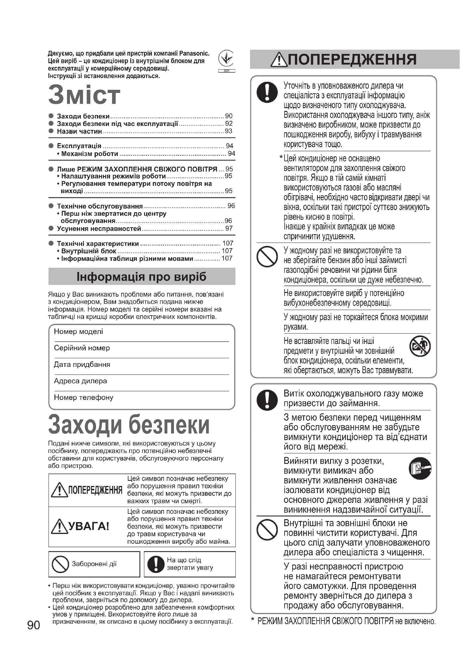 Цей символ позначає небезпеку або порушення правил техніки безпеки, які можуть призвести до травм користувача чи пошкодження виробу або майна. Заборонені діїНа що слід звертати увагу Дякуємо, що придбали цей пристрій компанії Panasonic. Цей виріб – це кондиціонер із внутрішнім блоком для експлуатації у комерційному середовищі. Інструкції зі встановлення додаються.