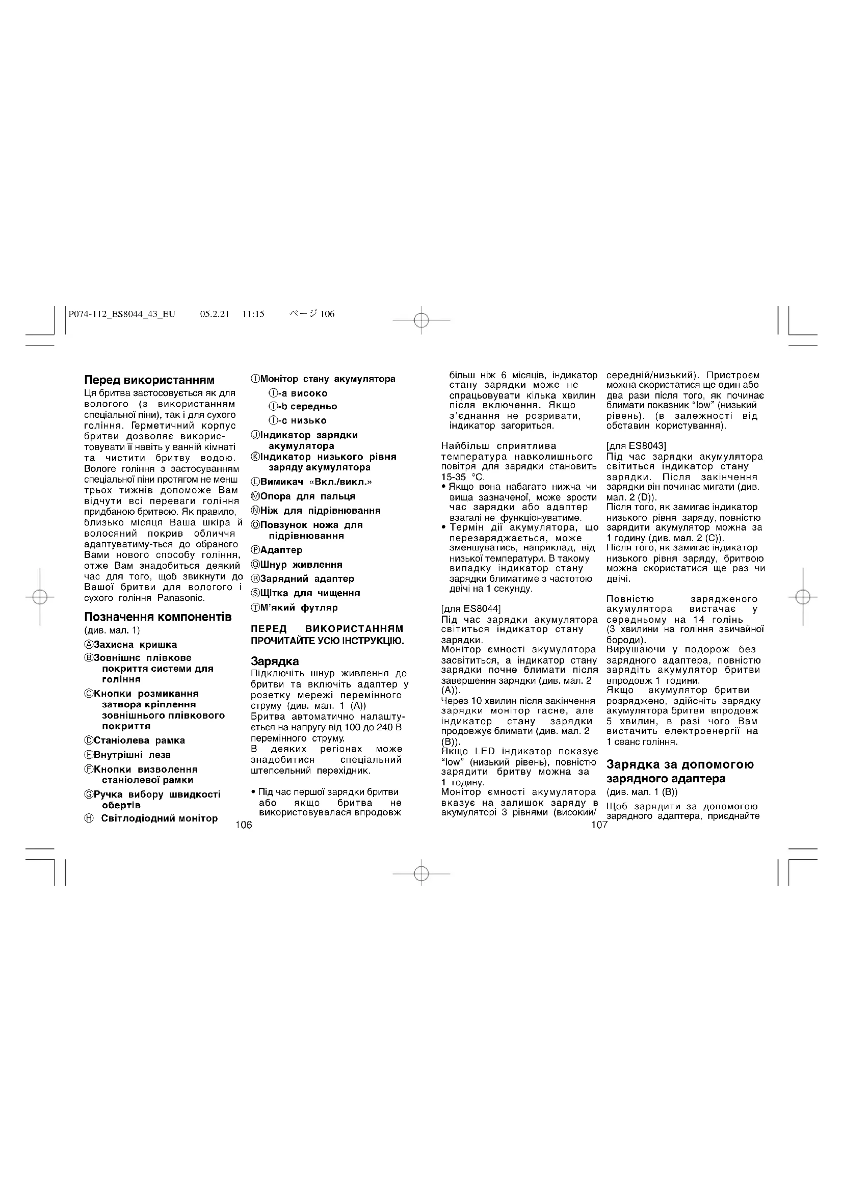 Перед використанням Ця бритва застосовується як для вологого (з використанням спеціальної піни), так і для сухого гоління. Герметичний корпус бритви дозволяє викорис- товувати її навіть у ванній кімнаті та чистити бритву водою. Вологе гоління з застосуванням спеціальної піни протягом не менш трьох тижнів допоможе Вам відчути всі переваги гоління придбаною бритвою. Як правило, близько місяця Ваша шкіра й волосяний покрив обличчя адаптуватиму-ться до обраного Вами нового способу гоління, отже Вам знадобиться деякий час для того, щоб звикнути до Вашої бритви для вологого і сухого гоління Panasonic. Позначення компонентів (див. мал. 1) A Захисна кришка B Зовнішнє плівкове покриття системи для