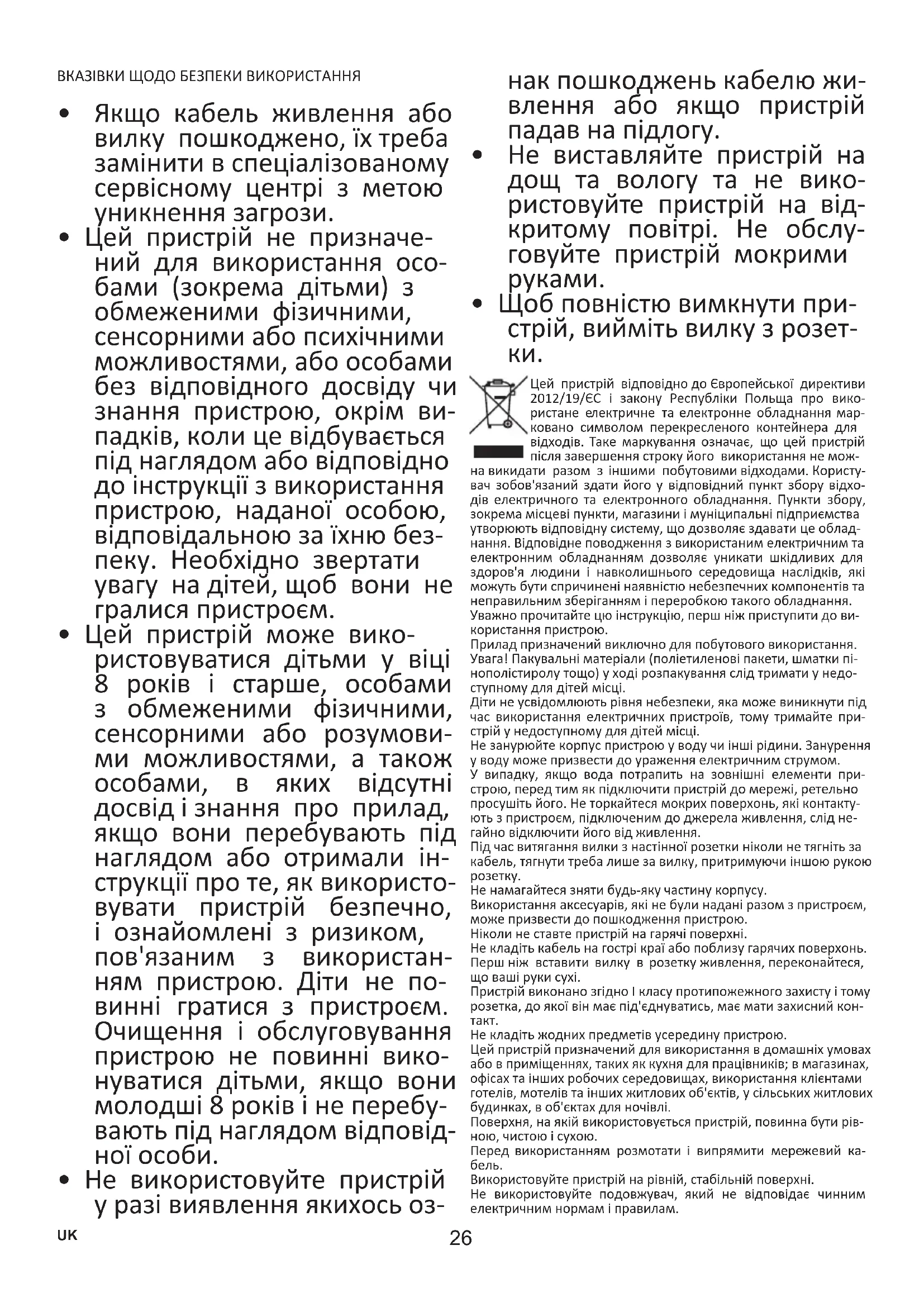 Цей пристрій відповідно до Європейської директиви 2012/19/ЄС і закону Республіки Польща про вико- ристане електричне та електронне обладнання мар- ковано символом перекресленого контейнера для відходів. Таке маркування означає, що цей пристрій після завершення строку його використання не мож- на викидати разом з іншими побутовими відходами. Користу- вач зобов'язаний здати його у відповідний пункт збору відхо- дів електричного та електронного обладнання. Пункти збору, зокрема місцеві пункти, магазини і муніципальні підприємства утворюють відповідну систему, що дозволяє здавати це облад- нання. Відповідне поводження з використаним електричним та електронним обладнанням дозволяє уникати шкідливих для здоров'я людини і навколишнього середовища наслідків, які можуть бути спричинені наявністю небезпечних компонентів та неправильним зберіганням і переробкою такого обладнання. Уважно прочитайте цю інструкцію, перш ніж приступити до ви- користання пристрою. Прилад призначений виключно для побутового використання. Увага! Пакувальні матеріали (поліетиленові пакети, шматки пі- нополістиролу тощо) у ході розпакування слід тримати у недо- ступному для дітей місці. Діти не усвідомлюють рівня небезпеки, яка може виникнути під час використання електричних пристроїв, тому тримайте при- стрій у недоступному для дітей місці. Не занурюйте корпус пристрою у воду чи інші рідини. Занурення у воду може призвести до ураження електричним струмом. У випадку, якщо вода потрапить на зовнішні елементи при- строю, перед тим як підключити пристрій до мережі, ретельно просушіть його. Не торкайтеся мокрих поверхонь, які контакту- ють з пристроєм, підключеним до джерела живлення, слід не- гайно відключити його від живлення. Під час витягання вилки з настінної розетки ніколи не тягніть за кабель, тягнути треба лише за вилку, притримуючи іншою рукою