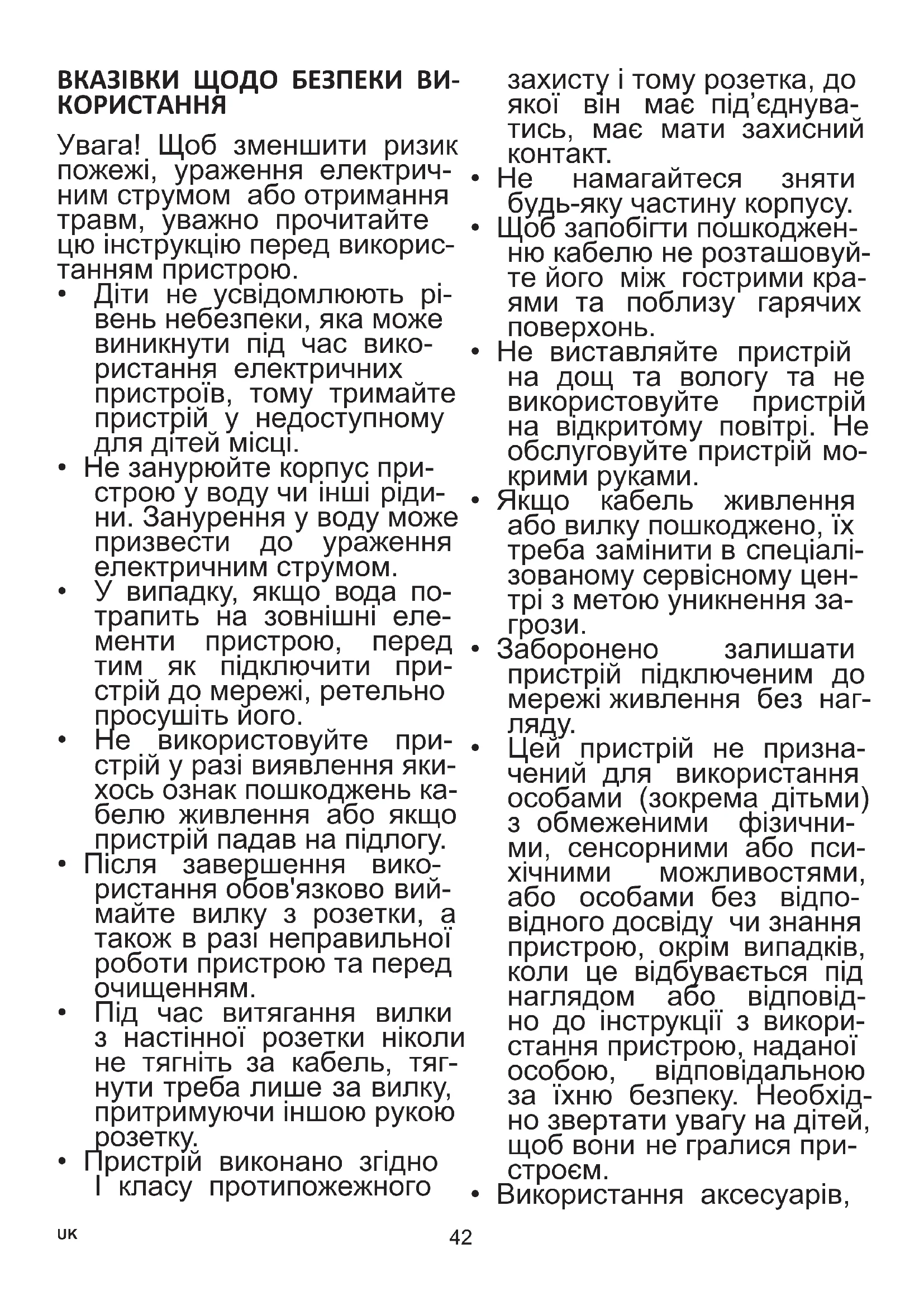Увага! Щоб зменшити ризик пожежі, ураження електрич- ним струмом або отримання травм, уважно прочитайте цю інструкцію перед викорис- танням пристрою.