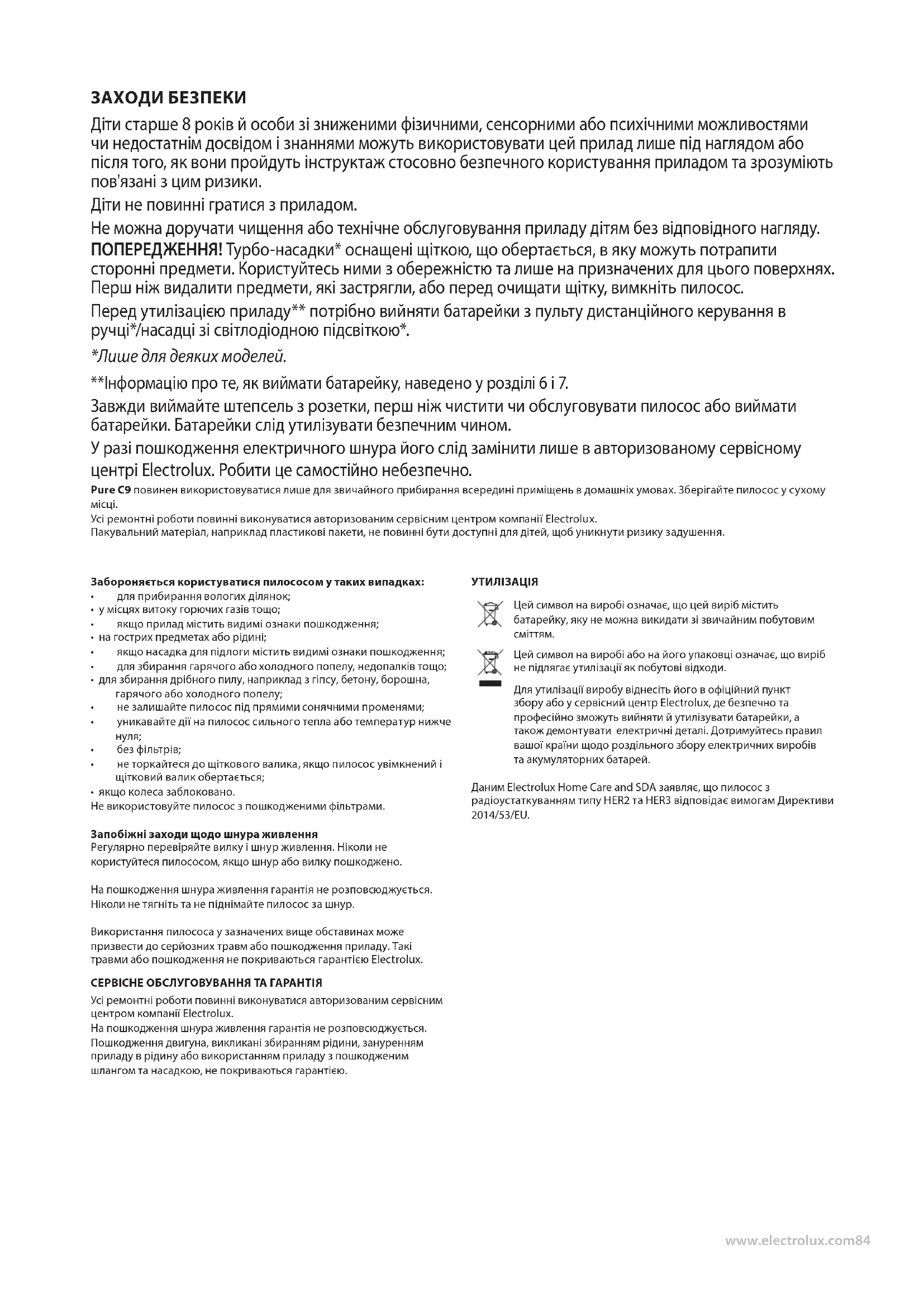 Цей символ на виробі або на його упаковці означає, що виріб не підлягає утилізації як побутові відходи. Для утилізації виробу віднесіть його в офіційний пункт збору або у сервісний центр Electrolux, де безпечно та професійно зможуть вийняти й утилізувати батарейки, а також демонтувати електричні деталі. Дотримуйтесь правил вашої країни щодо роздільного збору електричних виробів та акумуляторних батарей. Даним Electrolux Home Care and SDA заявляє, що пилосос з радіоустаткуванням типу HER2 та HER3 відповідає вимогам Директиви 2014/53/EU.85www.electrolux.com