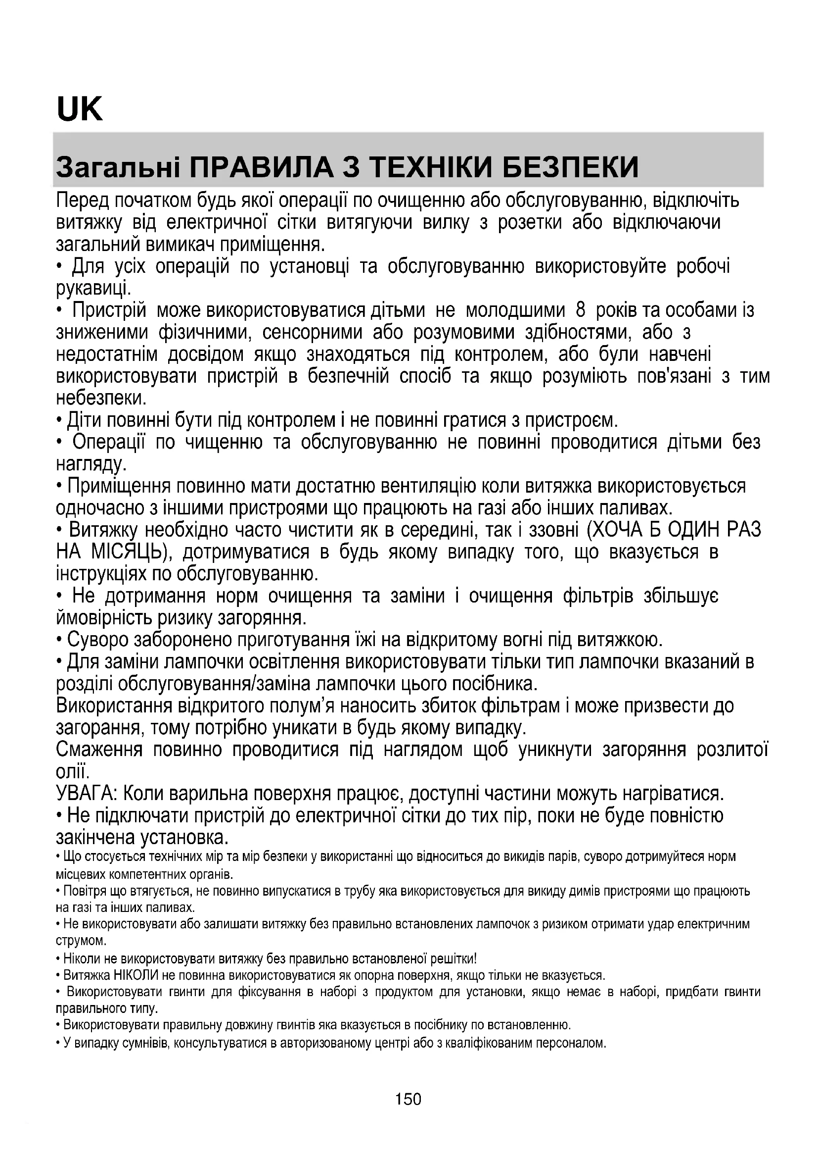 Загальні ПРАВИЛА З ТЕХНІКИ БЕЗПЕКИ Перед початком будь якої операції по очищенню або обслуговуванню, відключіть витяжку від електричної сітки витягуючи вилку з розетки або відключаючи загальний вимикач приміщення.