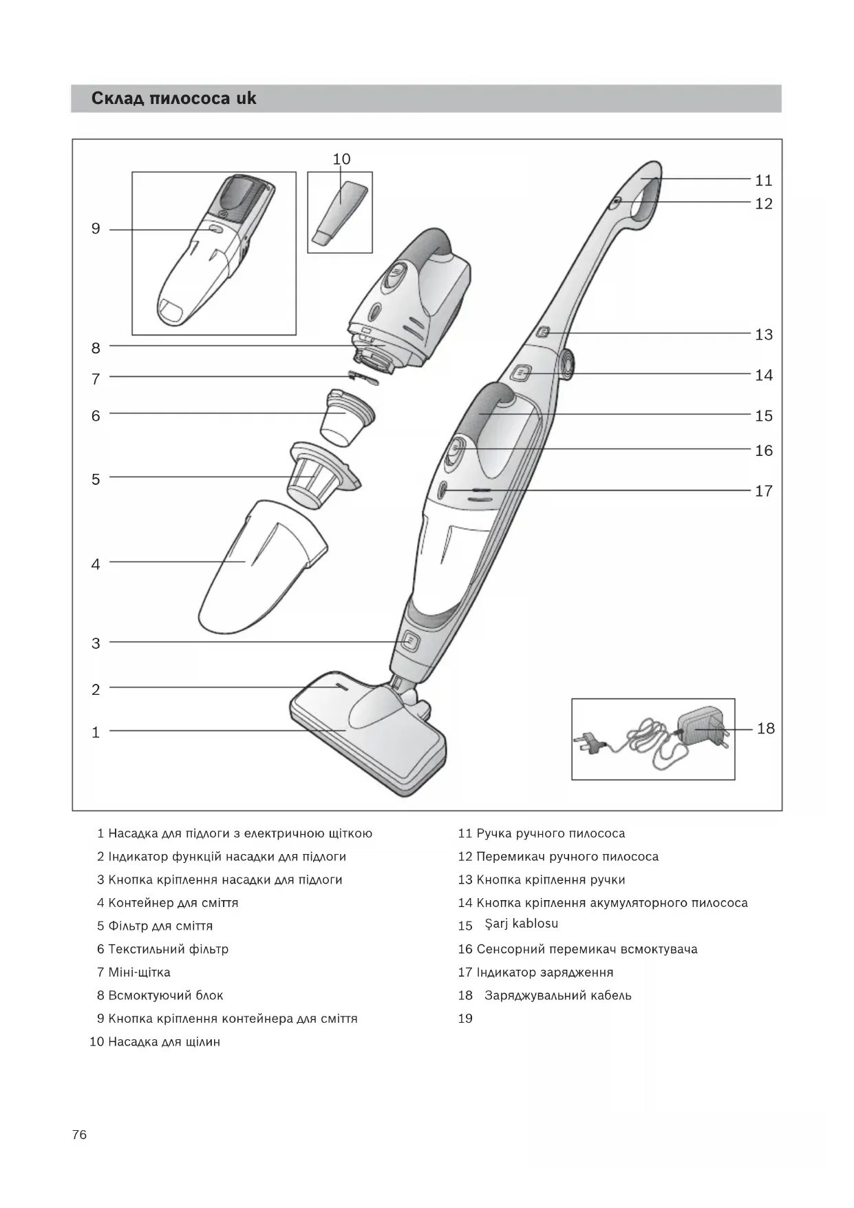 1 Насадка для підлоги з електричною щіткою 2 Індикатор функцій насадки для підлоги 3 Кнопка кріплення насадки для підлоги 4 Контейнер для сміття 5 Фільтр для сміття 6 Текстильний фільтр 7 Міні-щітка 8 Всмоктуючий блок 9 Кнопка кріплення контейнера для сміття 10 Насадка для щілин 11 Ручка ручного пилососа 12 Перемикач ручного пилососа 13 Кнопка кріплення ручки 14 Кнопка кріплення акумуляторного пилососа 15 Ручка акумуляторного всмоктувача 16 Сенсорний перемикач всмоктувача 17 Індикатор зарядження 18 Заряджувальна станція 19 Напільна підставка заряджувальної станції 20 Заряджувальний кабель Şarj kablosu Склад пилососа uk Заряджувальний кабель77