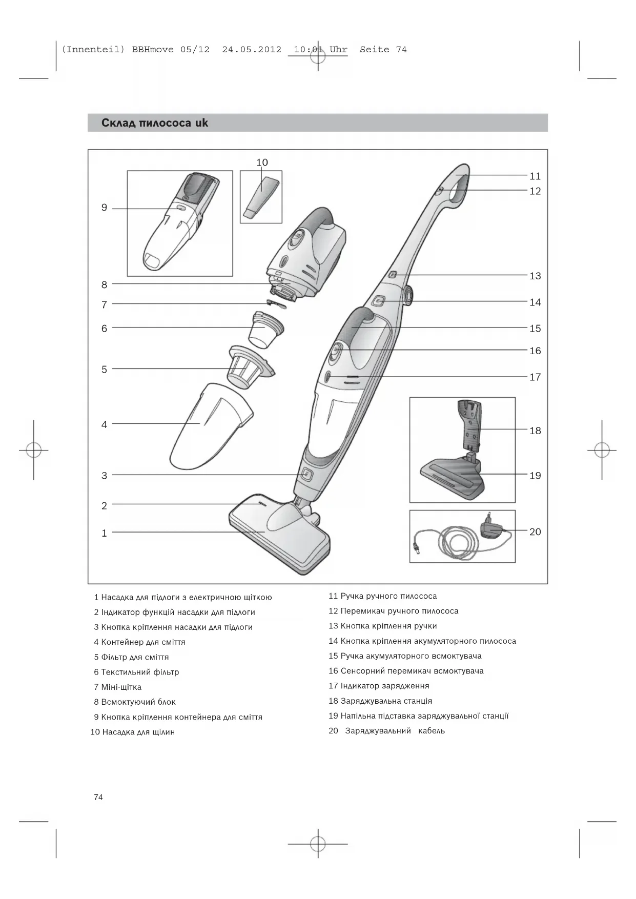 (Innenteil) BBHmove 05/12 24.05.2012 10:01 Uhr Seite 7374 Склад пилососа uk 1 Насадка для підлоги з електричною щіткою 2 Індикатор функцій насадки для підлоги 3 Кнопка кріплення насадки для підлоги 4 Контейнер для сміття 5 Фільтр для сміття 6 Текстильний фільтр 7 Міні-щітка 8 Всмоктуючий блок 9 Кнопка кріплення контейнера для сміття 10 Насадка для щілин 11 Ручка ручного пилососа 12 Перемикач ручного пилососа 13 Кнопка кріплення ручки 14 Кнопка кріплення акумуляторного пилососа 15 Ручка акумуляторного всмоктувача 16 Сенсорний перемикач всмоктувача 17 Індикатор зарядження 18 Заряджувальна станція 19 Напільна підставка заряджувальної станції 20 Заряджувальний кабель