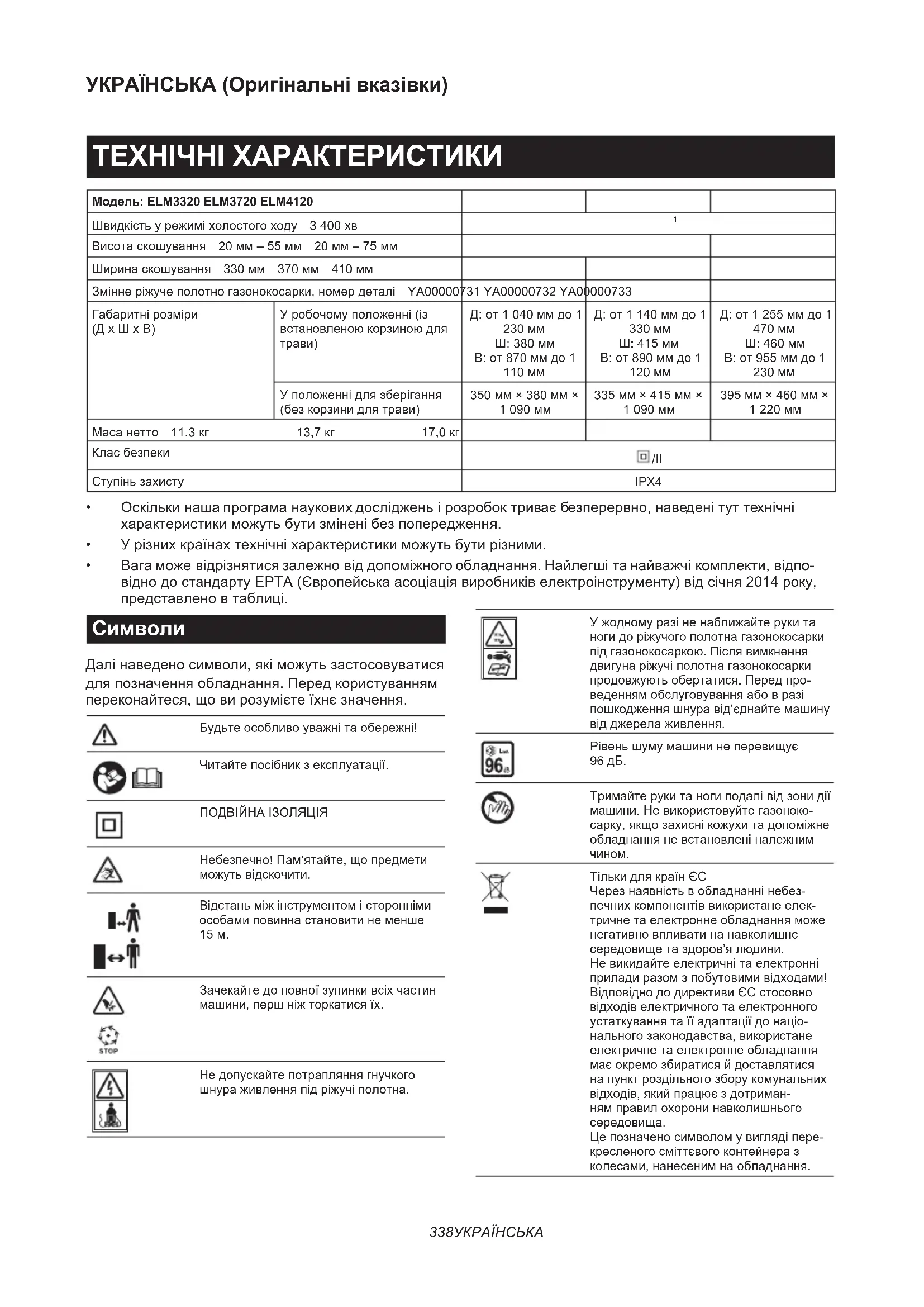 ТількидлякраїнЄС Черезнаявністьвобладнаннінебез- печнихкомпонентіввикористанеелек- тричнетаелектроннеобладнанняможе негативновпливатинанавколишнє середовищетаздоров’ялюдини. Невикидайтеелектричнітаелектронні приладиразомзпобутовимивідходами! ВідповіднододирективиЄСстосовно відходівелектричноготаелектронного устаткуваннятаїїадаптаціїдонаціо- нальногозаконодавства,використане електричнетаелектроннеобладнання маєокремозбиратисяйдоставлятися напунктроздільногозборукомунальних відходів,якийпрацюєздотриман- нямправилохоронинавколишнього середовища. Цепозначеносимволомувиглядіпере- кресленогосміттєвогоконтейнераз колесами,нанесенимнаобладнання.339 УКРАЇНСЬКА Призначення Газонокосаркапризначенадлякосіннягазонів.Не використовуйтеїївіншихцілях.Використаннягазо- нокосаркинезапризначеннямможепризвестидо виникненнянебезпечноїситуації. Джерело живлення Інструментможнапідключатилишедоджерела живлення,щомаєнапругу,зазначенувтабличці іззаводськимихарактеристиками,івінможепра- цюватилишевідоднофазногоджерелазмінного струму.Вінмаєподвійнуізоляцію,аотжеможе такожпідключатисядорозетокбезлініїзаземлення. Якщошнурживленняпошкоджено,замінітьйого увиробникаабойогопредставника,щобне створюватизагрозбезпеці. Для використання від низьковольтної мережі від 220 В до 250 В Увімкненняйвимкненняелектричногоприладу спричиняєколиваннянапруги.Експлуатаціяцього пристроюзанесприятливихумовмережіможе негативновплинутинароботуіншогообладнання. Якщоповнийопірмережінеперевищує0,425Ом (дляELM3720)або0,427Ом(дляELM4120),можна виходитизтого,щоінструментнечинитимежодного негативноговпливу.Мережеварозетка,доякоїбуде підключеноцейпристрій,маєбутизахищеназапо- біжникомабозахиснимавтоматичнимвимикачем плавногорозчіплювання.