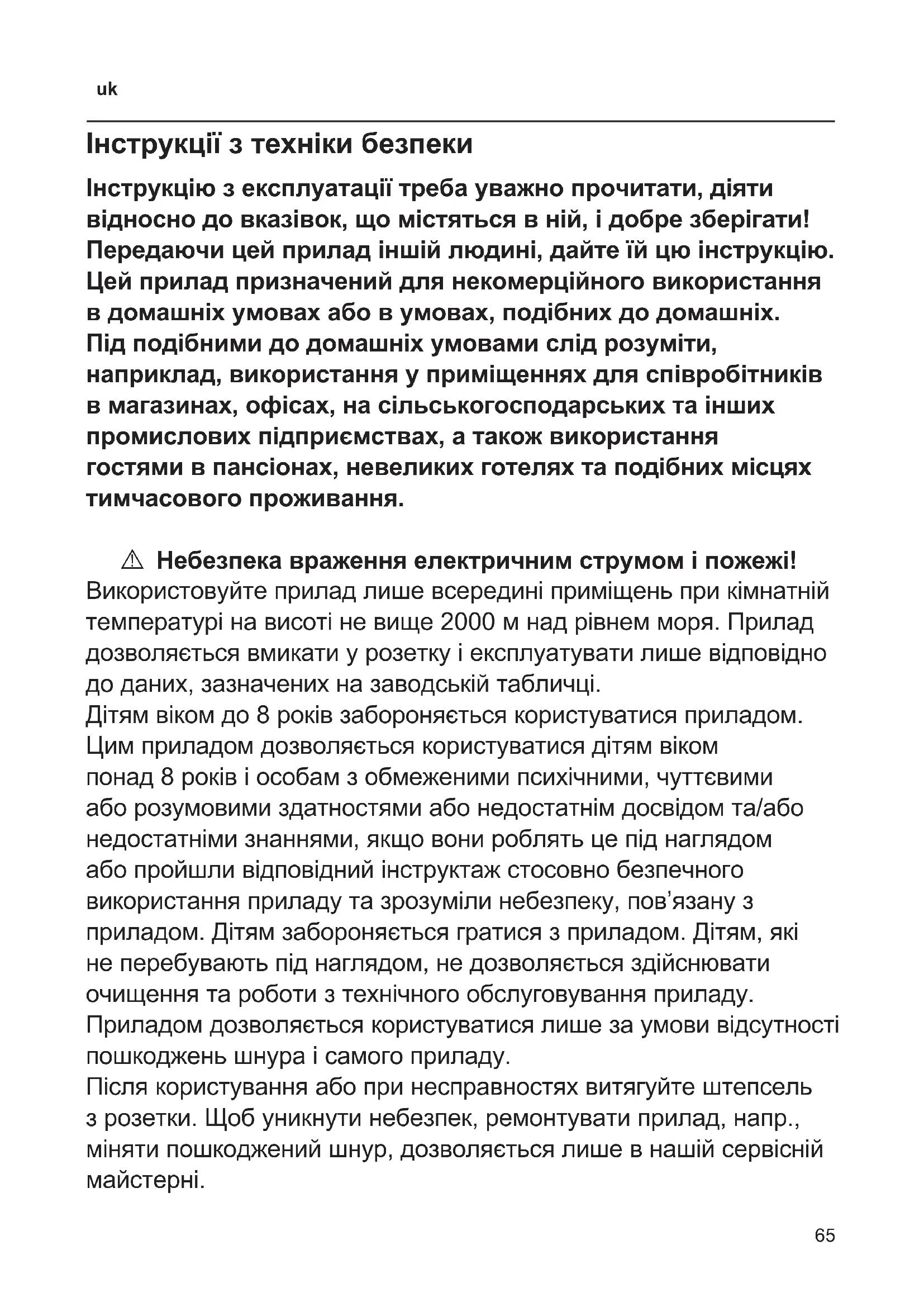 Інструкції з техніки безпеки Інструкцію з експлуатації треба уважно прочитати, діяти відносно до вказівок, що містяться в ній, і добре зберігати! Передаючи цей прилад іншій людині, дайте їй цю інструкцію. Цей прилад призначений для некомерційного використання в домашніх умовах або в умовах, подібних до домашніх. Під подібними до домашніх умовами слід розуміти, наприклад, використання у приміщеннях для співробітників в магазинах, офісах, на сільськогосподарських та інших промислових підприємствах, а також використання гостями в пансіонах, невеликих готелях та подібних місцях тимчасового проживання. A Небезпека враження електричним струмом і пожежі! Використовуйте прилад лише всередині приміщень при кімнатній температурі на висоті не вище 2000 м над рівнем моря. Прилад дозволяється вмикати у розетку і експлуатувати лише відповідно до даних, зазначених на заводській табличці. Дітям віком до 8 років забороняється користуватися приладом. Цим приладом дозволяється користуватися дітям віком понад 8 років і особам з обмеженими психічними, чуттєвими або розумовими здатностями або недостатнім досвідом та/або недостатніми знаннями, якщо вони роблять це під наглядом або пройшли відповідний інструктаж стосовно безпечного використання приладу та зрозуміли небезпеку, пов’язану з приладом. Дітям забороняється гратися з приладом. Дітям, які не перебувають під наглядом, не дозволяється здійснювати очищення та роботи з технічного обслуговування приладу. Приладом дозволяється користуватися лише за умови відсутності пошкоджень шнура і самого приладу. Після користування або при несправностях витягуйте штепсель з розетки. Щоб уникнути небезпек, ремонтувати прилад, напр., міняти пошкоджений шнур, дозволяється лише в нашій сервісній майстерні.66