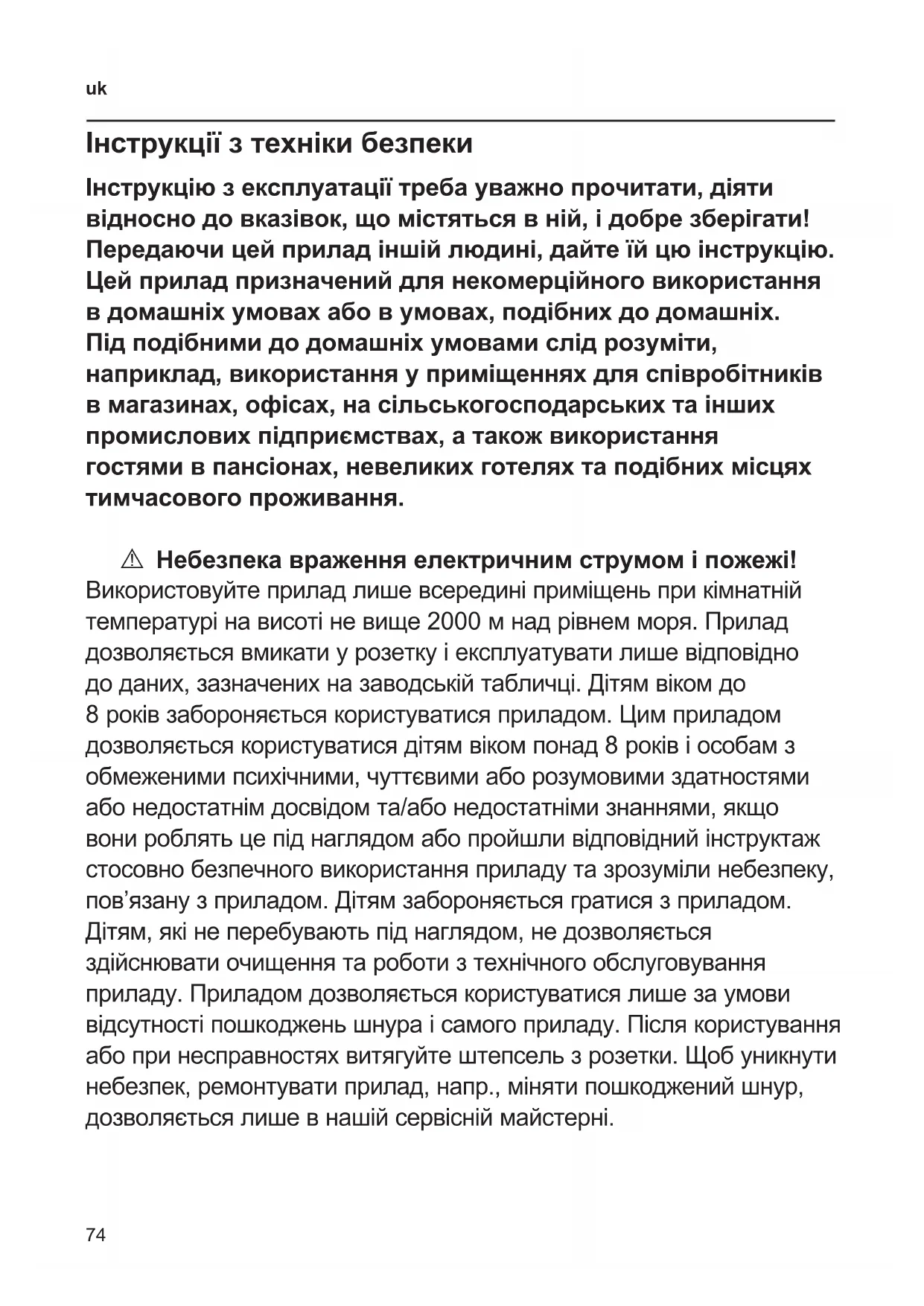 Інструкції з техніки безпеки Інструкцію з експлуатації треба уважно прочитати, діяти відносно до вказівок, що містяться в ній, і добре зберігати! Передаючи цей прилад іншій людині, дайте їй цю інструкцію. Цей прилад призначений для некомерційного використання в домашніх умовах або в умовах, подібних до домашніх. Під подібними до домашніх умовами слід розуміти, наприклад, використання у приміщеннях для співробітників в магазинах, офісах, на сільськогосподарських та інших промислових підприємствах, а також використання гостями в пансіонах, невеликих готелях та подібних місцях тимчасового проживання. A Небезпека враження електричним струмом і пожежі! Використовуйте прилад лише всередині приміщень при кімнатній температурі на висоті не вище 2000 м над рівнем моря. Прилад дозволяється вмикати у розетку і експлуатувати лише відповідно до даних, зазначених на заводській табличці. Дітям віком до 8 років забороняється користуватися приладом. Цим приладом дозволяється користуватися дітям віком понад 8 років і особам з обмеженими психічними, чуттєвими або розумовими здатностями або недостатнім досвідом та/або недостатніми знаннями, якщо вони роблять це під наглядом або пройшли відповідний інструктаж стосовно безпечного використання приладу та зрозуміли небезпеку, пов’язану з приладом. Дітям забороняється гратися з приладом. Дітям, які не перебувають під наглядом, не дозволяється здійснювати очищення та роботи з технічного обслуговування приладу. Приладом дозволяється користуватися лише за умови відсутності пошкоджень шнура і самого приладу. Після користування або при несправностях витягуйте штепсель з розетки. Щоб уникнути небезпек, ремонтувати прилад, напр., міняти пошкоджений шнур, дозволяється лише в нашій сервісній майстерні.75