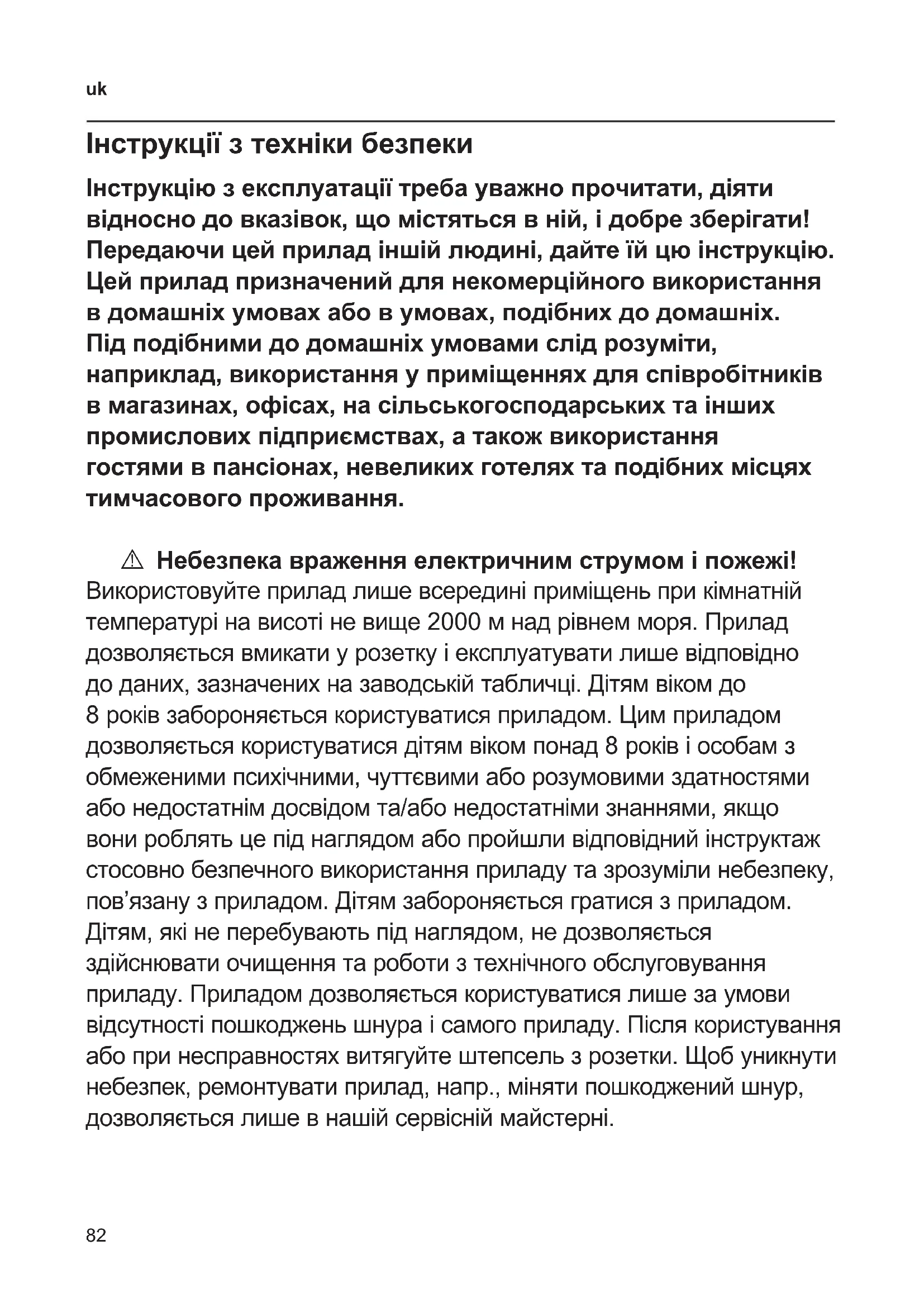 Інструкції з техніки безпеки Інструкцію з експлуатації треба уважно прочитати, діяти відносно до вказівок, що містяться в ній, і добре зберігати! Передаючи цей прилад іншій людині, дайте їй цю інструкцію. Цей прилад призначений для некомерційного використання в домашніх умовах або в умовах, подібних до домашніх. Під подібними до домашніх умовами слід розуміти, наприклад, використання у приміщеннях для співробітників в магазинах, офісах, на сільськогосподарських та інших промислових підприємствах, а також використання гостями в пансіонах, невеликих готелях та подібних місцях тимчасового проживання. A Небезпека враження електричним струмом і пожежі! Використовуйте прилад лише всередині приміщень при кімнатній температурі на висоті не вище 2000 м над рівнем моря. Прилад дозволяється вмикати у розетку і експлуатувати лише відповідно до даних, зазначених на заводській табличці. Дітям віком до 8 років забороняється користуватися приладом. Цим приладом дозволяється користуватися дітям віком понад 8 років і особам з обмеженими психічними, чуттєвими або розумовими здатностями або недостатнім досвідом та/або недостатніми знаннями, якщо вони роблять це під наглядом або пройшли відповідний інструктаж стосовно безпечного використання приладу та зрозуміли небезпеку, пов’язану з приладом. Дітям забороняється гратися з приладом. Дітям, які не перебувають під наглядом, не дозволяється здійснювати очищення та роботи з технічного обслуговування приладу. Приладом дозволяється користуватися лише за умови відсутності пошкоджень шнура і самого приладу. Після користування або при несправностях витягуйте штепсель з розетки. Щоб уникнути небезпек, ремонтувати прилад, напр., міняти пошкоджений шнур, дозволяється лише в нашій сервісній майстерні.83