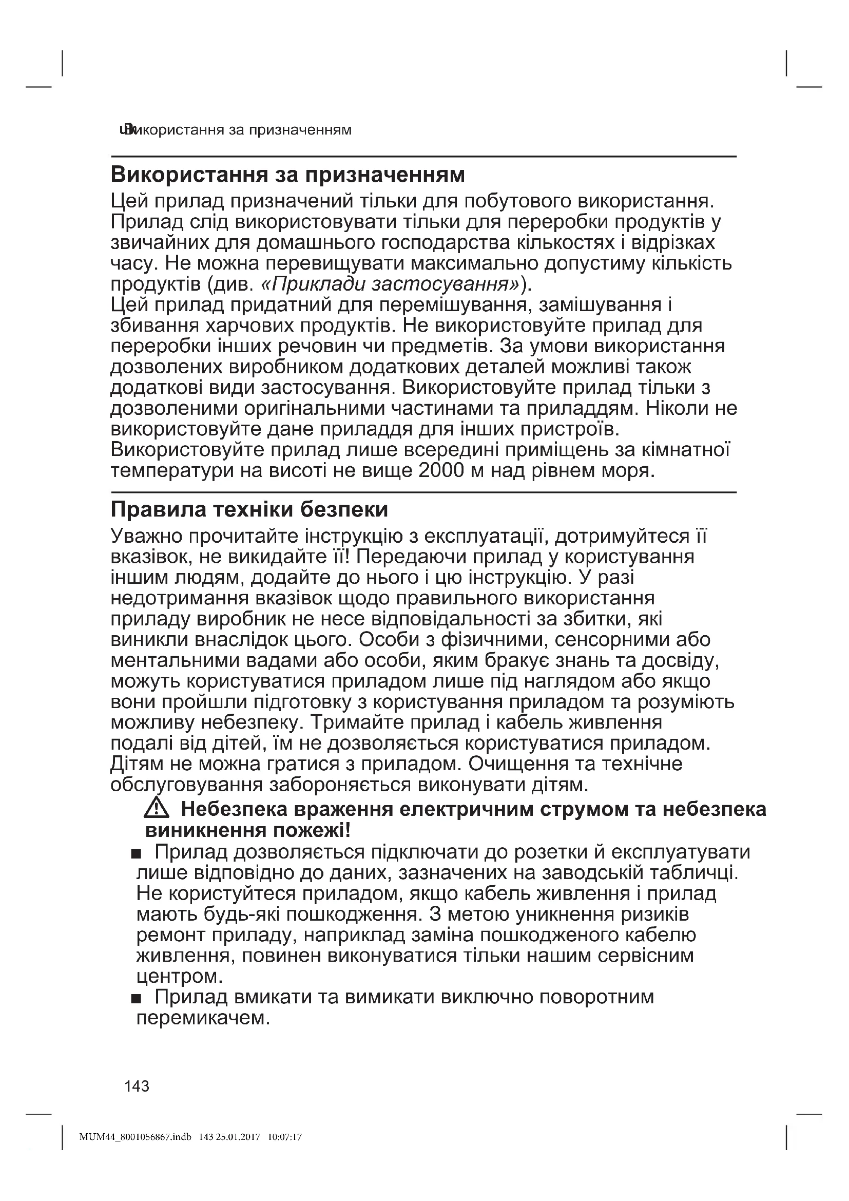 Використання за призначенням Використання за призначенням Цей прилад призначений тільки для побутового використання. Прилад слід використовувати тільки для переробки продуктів у звичайних для домашнього господарства кількостях і відрізках часу. Не можна перевищувати максимально допустиму кількість продуктів (див. «Прикладизастосування»). Цей прилад придатний для перемішування, замішування і збивання харчових продуктів. Не використовуйте прилад для переробки інших речовин чи предметів. За умови використання дозволених виробником додаткових деталей можливі також додаткові види застосування. Використовуйте прилад тільки з дозволеними оригінальними частинами та приладдям. Ніколи не використовуйте дане приладдя для інших пристроїв. Використовуйте прилад лише всередині приміщень за кімнатної температури на висоті не вище 2000 м над рівнем моря. Правила техніки безпеки Уважно прочитайте інструкцію з експлуатації, дотримуйтеся її вказівок, не викидайте її! Передаючи прилад у користування іншим людям, додайте до нього і цю інструкцію. У разі недотримання вказівок щодо правильного використання приладу виробник не несе відповідальності за збитки, які виникли внаслідок цього. Особи з фізичними, сенсорними або ментальними вадами або особи, яким бракує знань та досвіду, можуть користуватися приладом лише під наглядом або якщо вони пройшли підготовку з користування приладом та розуміють можливу небезпеку. Тримайте прилад і кабель живлення подалі від дітей, їм не дозволяється користуватися приладом. Дітям не можна гратися з приладом. Очищення та технічне обслуговування забороняється виконувати дітям. W Небезпека враження електричним струмом та небезпека виникнення пожежі! ■ Прилад дозволяється підключати до розетки й експлуатувати лише відповідно до даних, зазначених на заводській табличці. Не користуйтеся приладом, якщо кабель живлення і прилад мають будьякі пошкодження. З метою уникнення ризиків ремонт приладу, наприклад заміна пошкодженого кабелю живлення, повинен виконуватися тільки нашим сервісним
