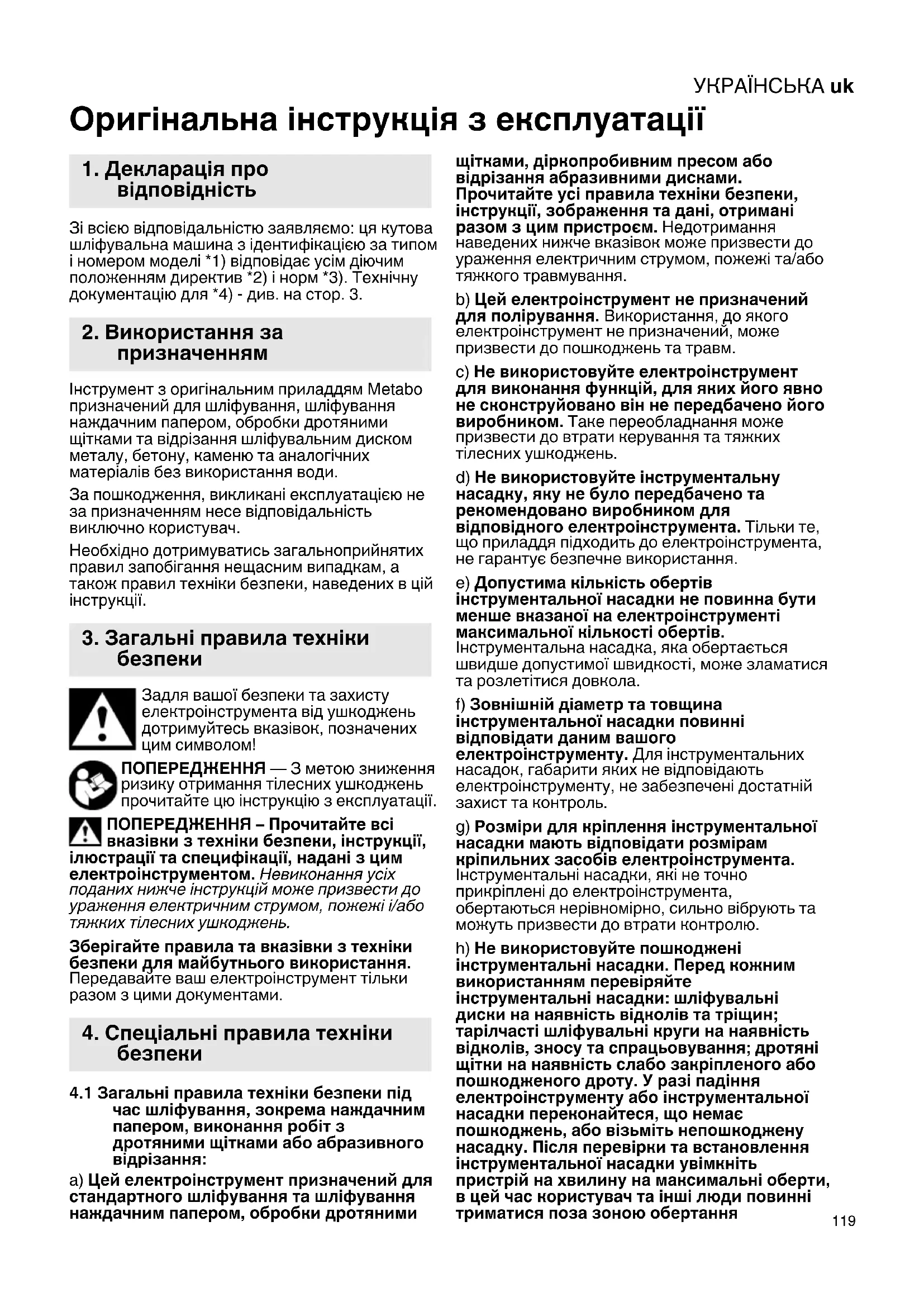 Оригінальна інструкція з експлуатації Зі всією відповідальністю заявляємо: ця кутова шліфувальна машина з ідентифікацією за типом і номером моделі *1) відповідає усім діючим положенням директив *2) і норм *3). Технічну документацію для *4) - див. на стор. 3. Інструмент з оригінальним приладдям Metabo призначений для шліфування, шліфування наждачним папером, обробки дротяними щітками та відрізання шліфувальним диском металу, бетону, каменю та аналогічних матеріалів без використання води. За пошкодження, викликані експлуатацією не за призначенням несе відповідальність виключно користувач. Необхідно дотримуватись загальноприйнятих правил запобігання нещасним випадкам, а також правил техніки безпеки, наведених в цій інструкції. Задля вашої безпеки та захисту електроінструмента від ушкоджень дотримуйтесь вказівок, позначених цим символом! ПОПЕРЕДЖЕННЯ — З метою зниження ризику отримання тілесних ушкоджень прочитайте цю інструкцію з експлуатації. ПОПЕРЕДЖЕННЯ – Прочитайте всі вказівки з техніки безпеки, інструкції, ілюстрації та специфікації, надані з цим електроінструментом. Невиконання усіх поданих нижче інструкцій може призвести до ураження електричним струмом, пожежі і/або тяжких тілесних ушкоджень. Зберігайте правила та вказівки з техніки безпеки для майбутнього використання. Передавайте ваш електроінструмент тільки разом з цими документами.