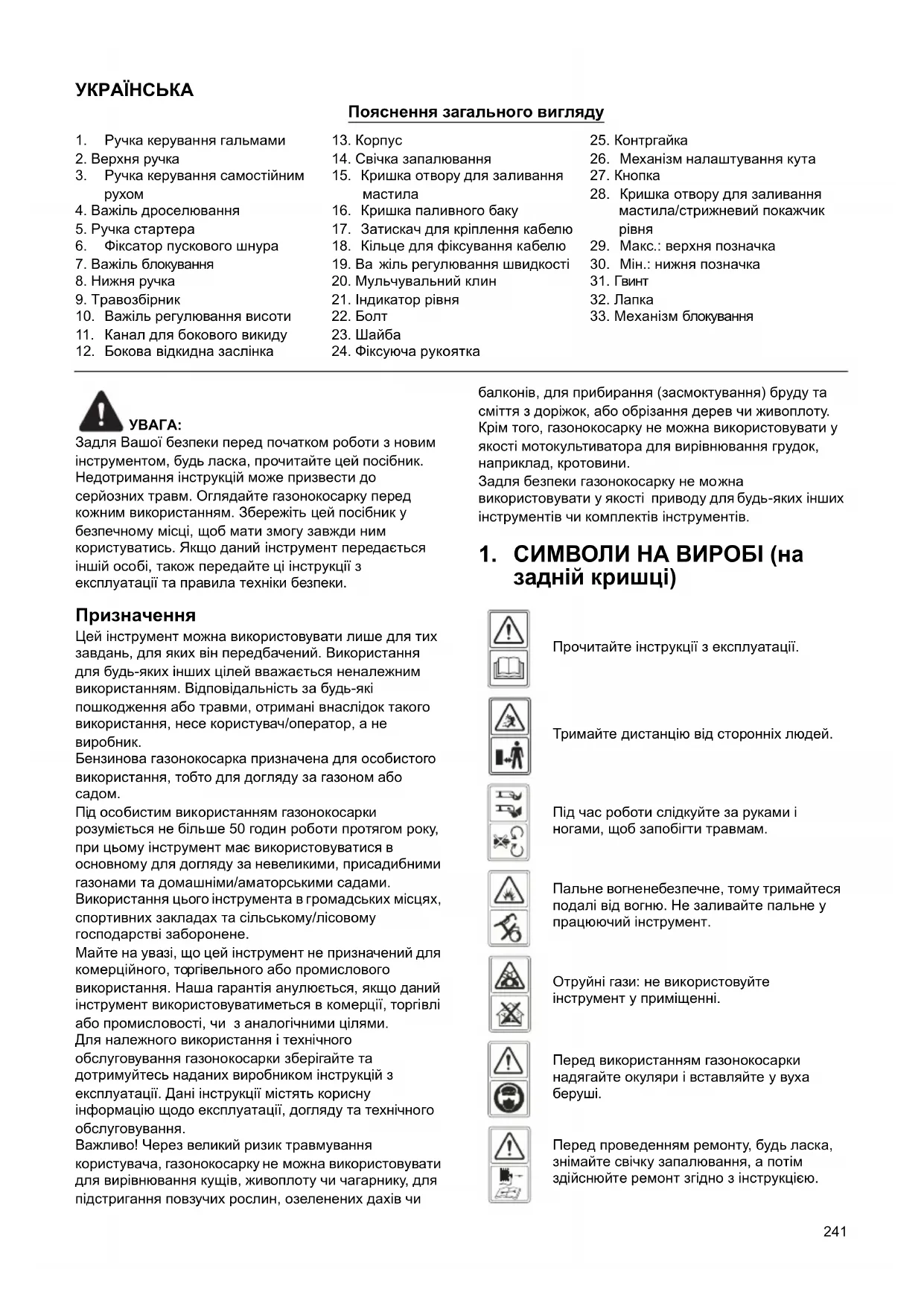 - Використовуйте газонокосарку тільки за умов денного світла або при яскравому штучному освітленні. Застереження: двигун гарячий.243
