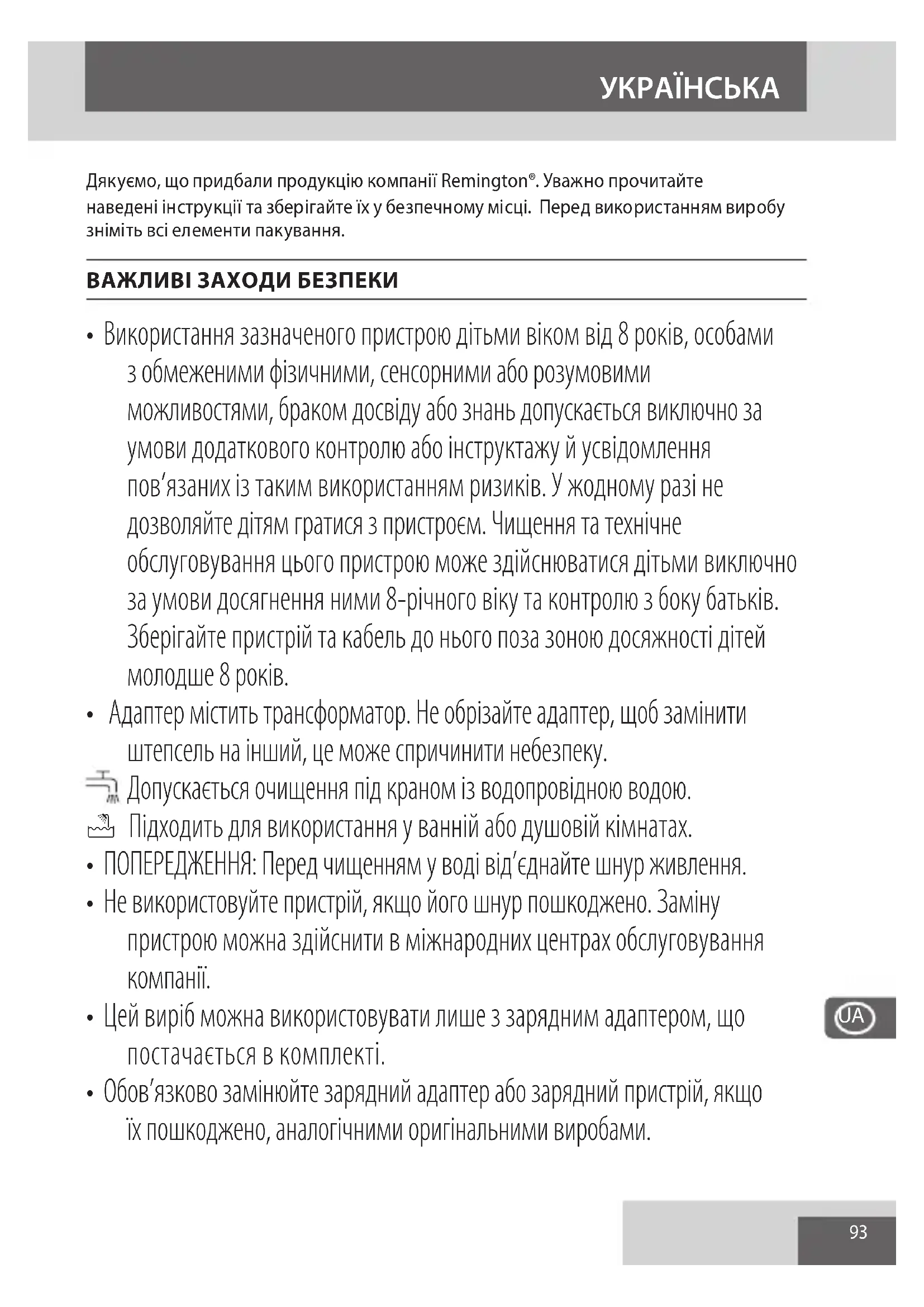 Щоб не завдати шкоди довкіллю та здоров’ю людей через дію небезпечних речовин, не слід утилізувати пристрої й батареї одноразового або багаторазового використання, що позначені одним із цих символів, разом із невідсортованим побутовим сміттям. Обов’язково утилізуйте електричні й електронні вироби, а також, де можливо, батареї одноразового або багаторазового використання у відповідном у офіційному пункті переробки/збору.98 Благодарим Ви, че закупихте нов продукт на Remington. Моля, прочетете внимателно инструкцията за употреба и я запазете. Отстранете всички опаковки преди употреба. ВАЖНИ ИНСТРУКЦИИ ЗА БЕЗОПАСНОСТ