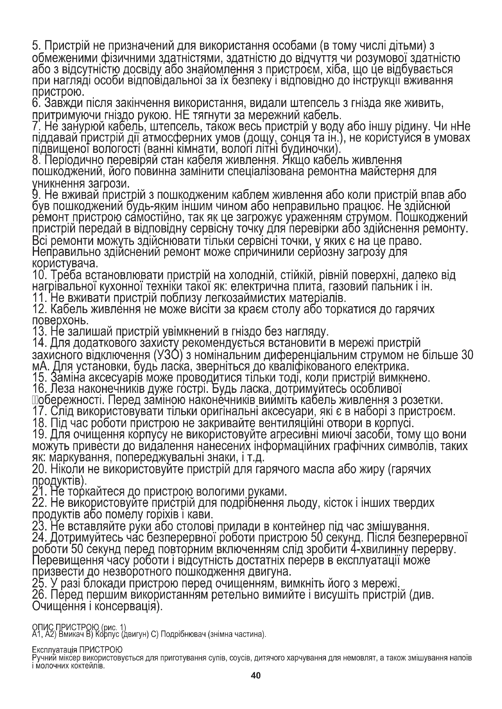 змочену в олії. 2. Накладку вкласти глибоко в блюдо, наповнене продуктами для змішування і включити міксер, натиснувши на кнопку (мал. 1, A1 або A2). Примітка: Захищати моторну частину міксера (рис. 1, B) від намокання. Не мити в посудомийній машині, не промивати під проточною водою. Перед тим, як приступити до очищення, витягнути кабель живленняз розетки.