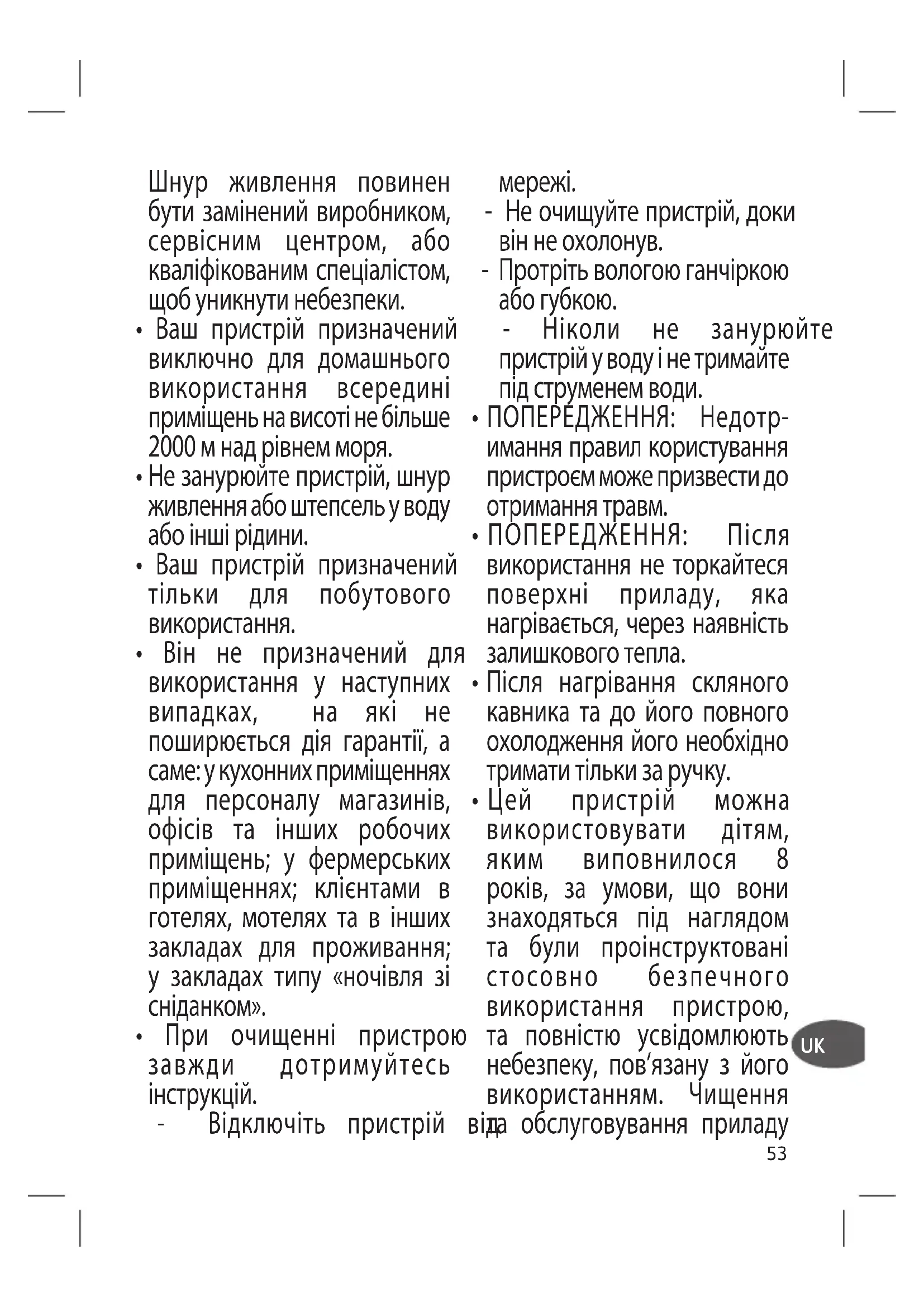 - Не використовуйте пристрій, якщо пошкоджено шнур живлення або штепсель.53