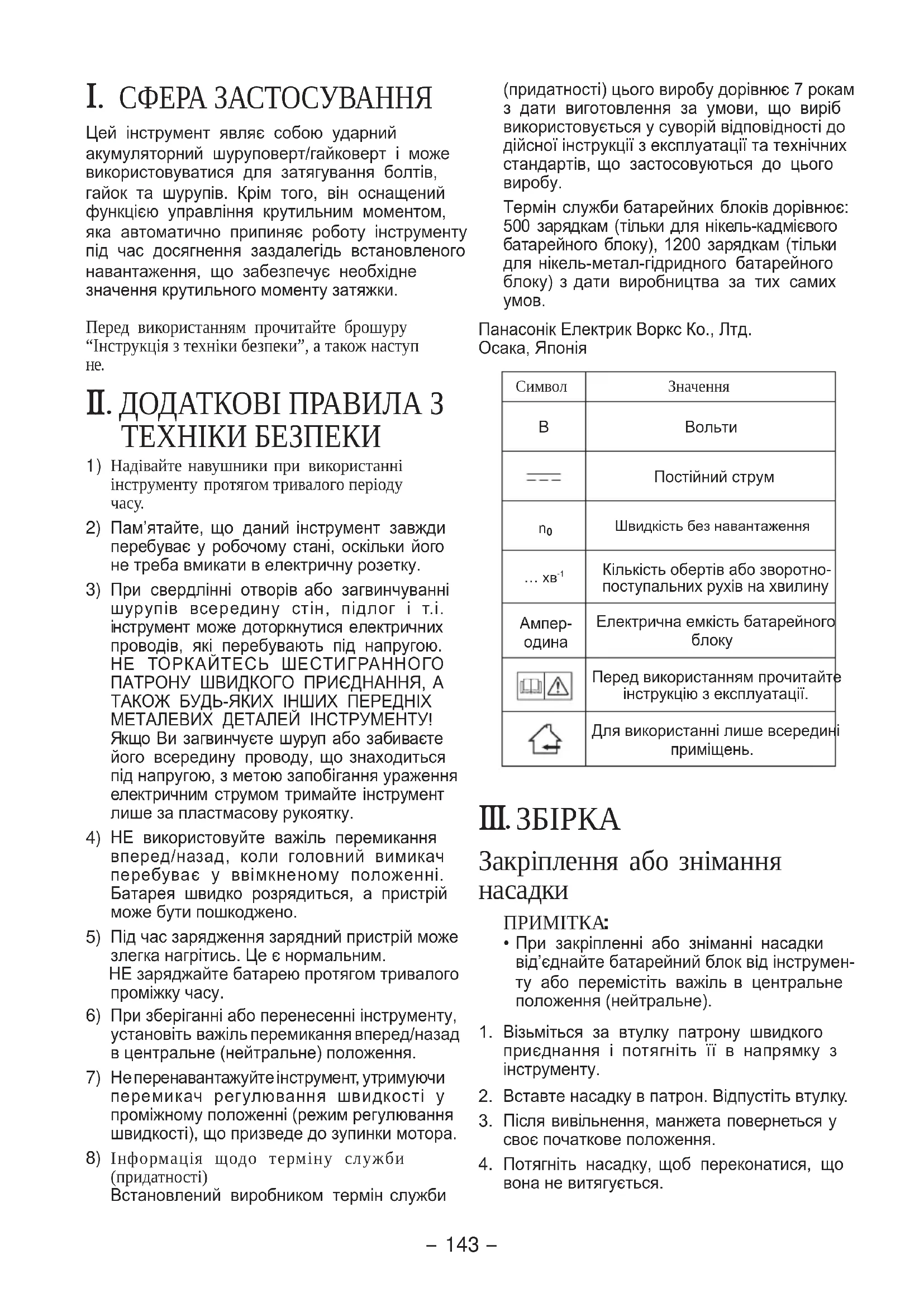 СФЕРА ЗАСТОСУВАННЯ Цей інструмент являє собою ударний акумуляторний шуруповерт/гайковерт і може використовуватися для затягування болтів, гайок та шурупів. Крім того, він оснащений функцією управління крутильним моментом, яка автоматично припиняє роботу інструменту під час досягнення заздалегідь встановленого навантаження, що забезпечує необхідне значення крутильного моменту затяжки. Перед використанням прочитайте брошуру “Інструкція з техніки безпеки”, а також наступ
