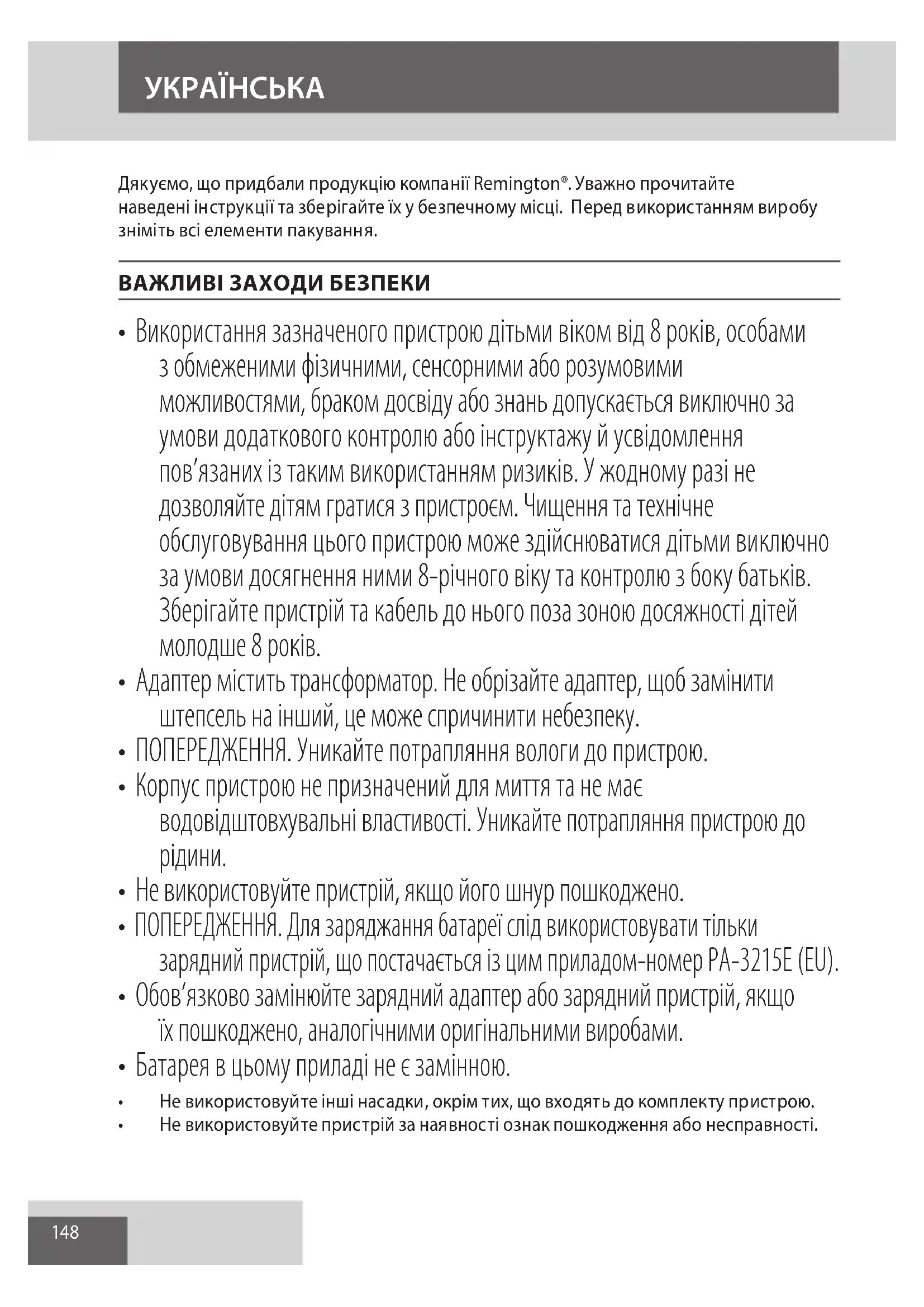 HRVATSKI JEZIK148 Дякуємо, що придбали продукцію компанії Remington®. Уважно прочитайте наведені інструкції та зберігайте їх у безпечному місці. Перед використанням виробу зніміть всі елементи пакування. ВАЖЛИВІ ЗАХОДИ БЕЗПЕКИ