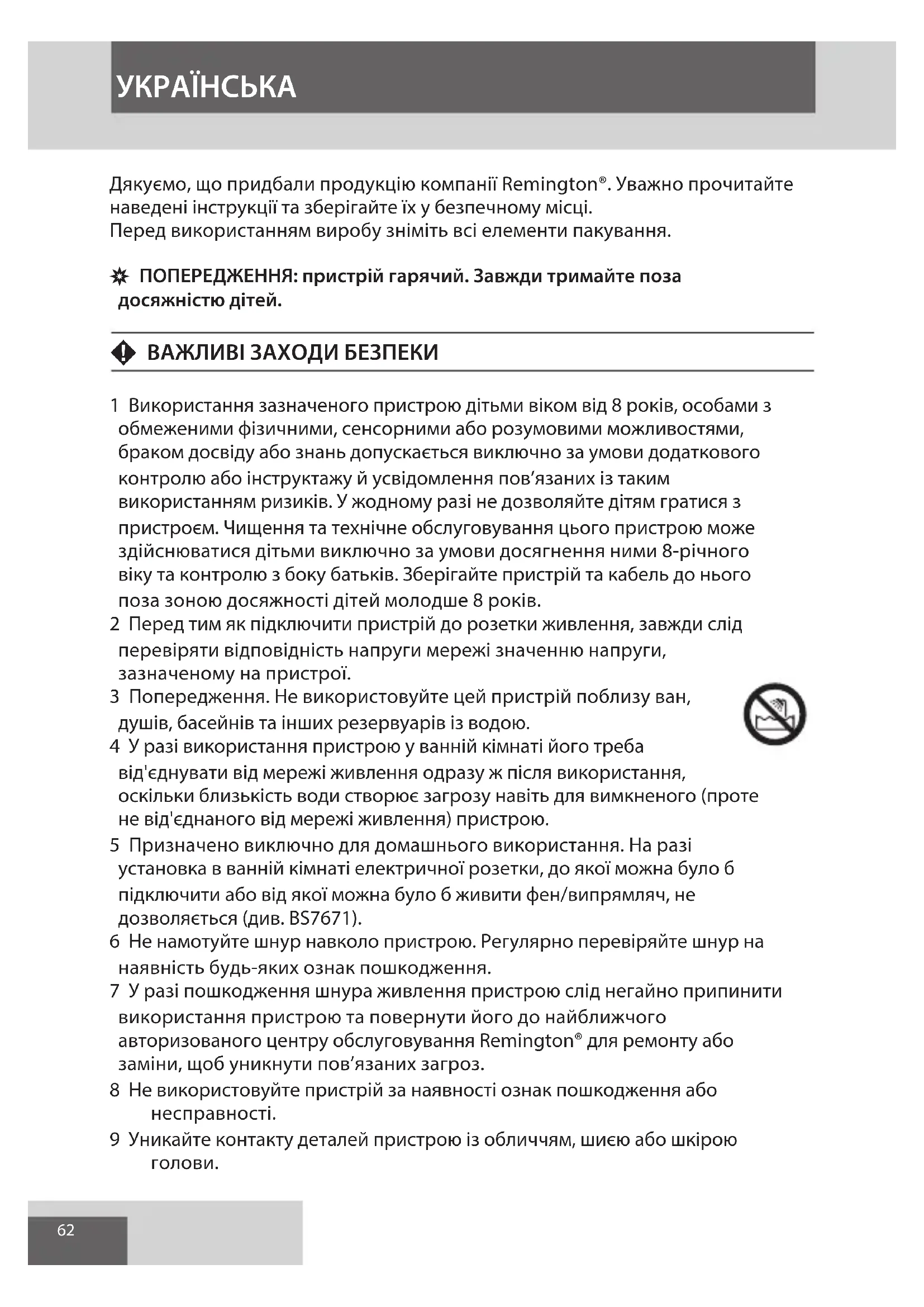 Kako bi se izbjegle štetne posljedice na okoliš i zdravlje zbog opasnih supstanci u električnim i elektronskim proizvodima, svi uređaji obilježeni ovim simbolom ne smiju se zbrinjavati kao nerazvrstani komunalni otpad, već se moraju prikupiti, ponovno koristiti ili reciklirati. HRVATSKI JEZIK GBDNLFEIDKSFINPSKCZ HUN PLRUTRROGRSI AE HR UA62 Дякуємо, що придбали продукцію компанії Remington®. Уважно прочитайте наведені інструкції та зберігайте їх у безпечному місці. Перед використанням виробу зніміть всі елементи пакування. , ПОПЕРЕДЖЕННЯ: пристрій гарячий. Завжди тримайте поза досяжністю дітей. F ВАЖЛИВІ ЗАХОДИ БЕЗПЕКИ 1 Використання зазначеного пристрою дітьми віком від 8 років, особами з обмеженими фізичними, сенсорними або розумовими можливостями, браком досвіду або знань допускається виключно за умови додаткового контролю або інструктажу й усвідомлення пов’язаних із таким використанням ризиків. У жодному разі не дозволяйте дітям гратися з пристроєм. Чищення та технічне обслуговування цього пристрою може здійснюватися дітьми виключно за умови досягнення ними 8-річного віку та контролю з боку батьків. Зберігайте пристрій та кабель до нього поза зоною досяжності дітей молодше 8 років. 2 Перед тим як підключити пристрій до розетки живлення, завжди слід перевіряти відповідність напруги мережі значенню напруги, зазначеному на пристрої. 3 Попередження. Не використовуйте цей пристрій поблизу ван, душів, басейнів та інших резервуарів із водою. 4 У разі використання пристрою у ванній кімнаті його треба від'єднувати від мережі живлення одразу ж після використання, оскільки близькість води створює загрозу навіть для вимкненого (проте не від'єднаного від мережі живлення) пристрою. 5 Призначено виключно для домашнього використання. На разі установка в ванній кімнаті електричної розетки, до якої можна було б підключити або від якої можна було б живити фен/випрямляч, не дозволяється (див. BS7671). 6 Не намотуйте шнур навколо пристрою. Регулярно перевіряйте шнур на наявність будь-яких ознак пошкодження. 7 У разі пошкодження шнура живлення пристрою слід негайно припинити використання пристрою та повернути його до найближчого авторизованого центру обслуговування Remington® для ремонту або заміни, щоб уникнути пов’язаних загроз. 8 Не використовуйте пристрій за наявності ознак пошкодження або несправності. 9 Уникайте контакту деталей пристрою із обличчям, шиєю або шкірою