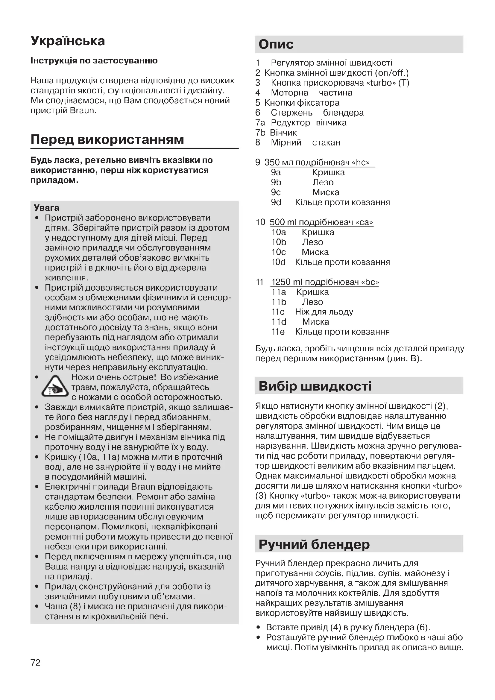 1 Регулятор змінної швидкості 2 Кнопка змінної швидкості (on/off.) 3 Кнопка прискорювача «turbo» (T) 4 Моторна частина 5 Кнопки фіксатора 6 Стержень блендера 7а Редуктор вінчика 7b Вінчик 8 Мірний стакан 9 350 мл подрібнювач «hc» 9а Кришка 9b Лезо 9c Миска 9d Кільце проти ковзання 10 500 ml подрібнювач «ca» 10а Кришка 10b Лезо 10c Миска 10d Кільце проти ковзання 11 1250 ml подрібнювач «bc» 11a Кришка 11b Лезо 11c Ніж для льоду 11d Миска 11e Кільце проти ковзання Будь ласка, зробіть чищенн я всіх деталей приладу перед першим використанням (див. В). Вибір швидкості Якщо натиснути кнопку змінної швидкості (2), швидкість обробки відповідає налаштуванню регулятора змінної швидкості. Чим вище це налаштування, тим швидше відбувається нарізування. Швидкість можна зручно регулюва- ти під час роботи приладу, повертаючи регуля- тор швидкості великим або вказівним пальцем. Однак максимальної швидкості обробки можна досягти лише шляхом натискання кнопки «turbo» (3) Кнопку «turbo» також можна використовувати для миттєвих потужних імпульсів замість того, щоб перемикати регулятор швидкості. Ручний блендер Ручний блендер прекрасно личить для приготування соусів, підлив, супів, майонезу і дитячого харчування, а також для змішування напоїв та молочних коктейлів. Для здобуття найкращих результатів змішування використовуйте найвищу швидкість.