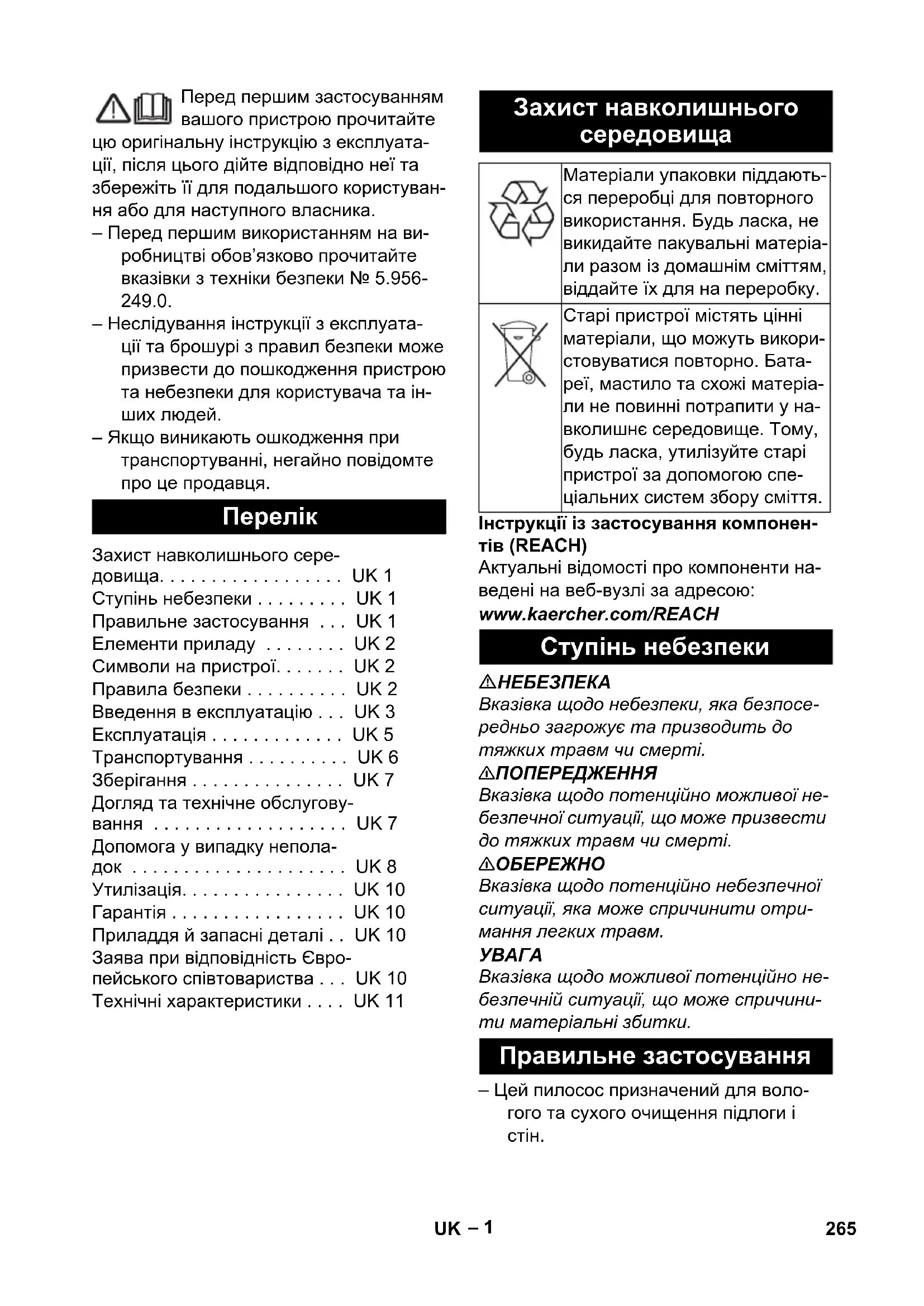 – Якщо виникають ошкодження при транспортуванні, негайно повідомте про це продавця. Інструкції із застосування компонен- тів (REACH) Актуальні відомості про компоненти на- ведені на веб-вузлі за адресою: www.kaercher.com/REACH
