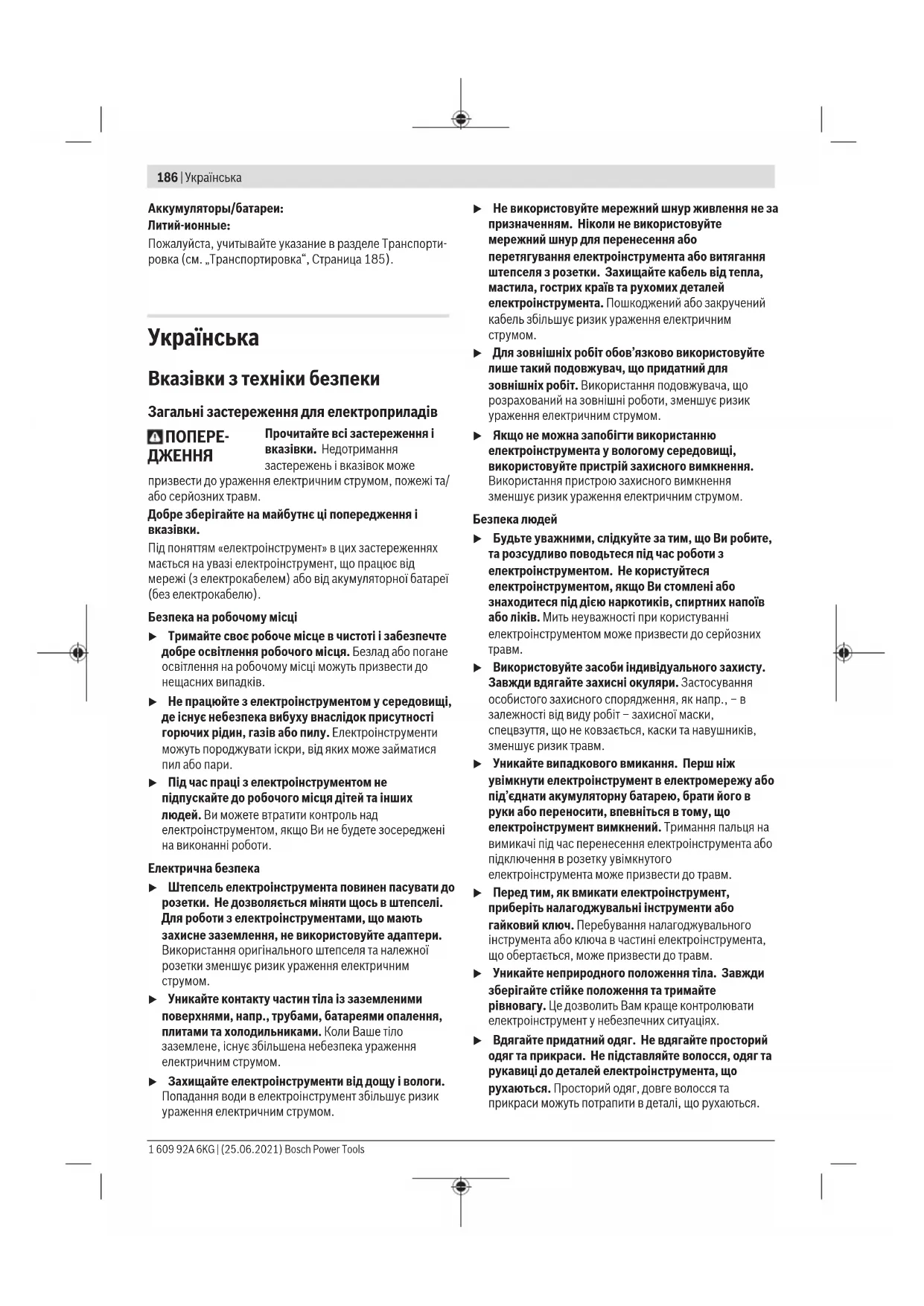 Правильне поводження та користування електроінструментами, що працюють на акумуляторних батареях u Заряджайте акумуляторні батареї лише в заряджувальних пристроях, рекомендованих виготовлювачем. Використання заряджувального пристрою для акумуляторних батарей, для яких він не передбачений, може призводити до пожежі. u Використовуйте в електроінструментах лише рекомендовані акумуляторні батареї. Використання інших акумуляторних батарей може призводити до травм та пожежі. u Не зберігайте акумуляторну батарею, якою Ви саме не користуєтеся, поряд із канцелярськими скріпками, ключами, цвяхами, гвинтами та іншими невеликими металевими предметами, які можуть спричинити перемикання контактів. Коротке замикання між контактами акумуляторної батареї може спричиняти опіки або пожежу. u При неправильному використанні з акумуляторної батареї може потекти рідина. Уникайте контакту з нею. При випадковому контакті промийте відповідне місце водою. Якщо рідина потрапила в очі, додатково зверніться до лікаря. Акумуляторна рідина може спричиняти подразнення шкіри або