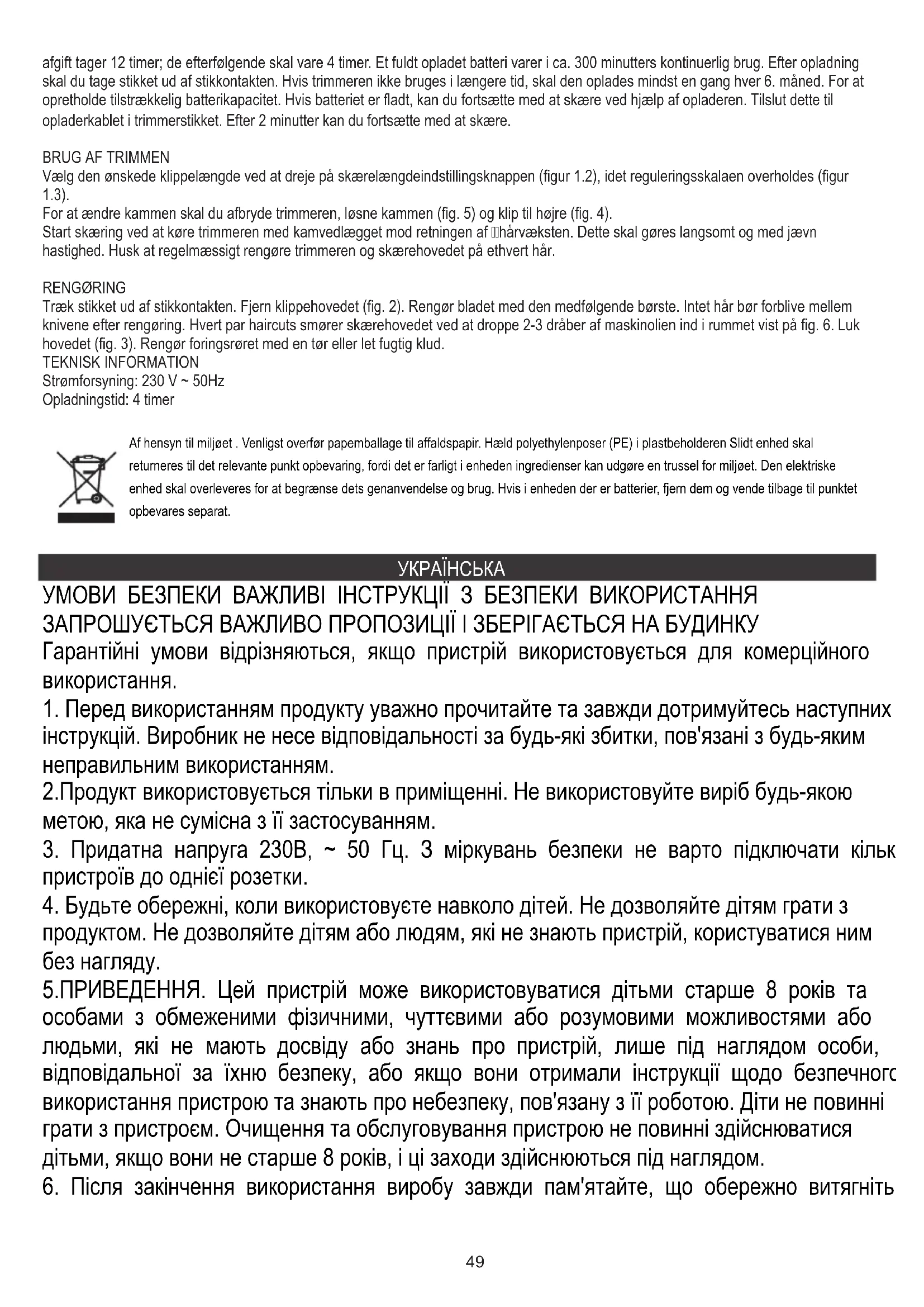 Від'єднайте пристрій від джерела живлення. Зніміть ріжучу головку (мал. 2). Очистіть ножиці за допомогою включеної щітки. Ніяке волосся не повинно залишатися між лопатями після чищення. Кожну кількість стрижок змащують ріжучої голівкою, скинувши 2-3 краплі машинного масла в пробіл, показаний на мал. 6. Закрийте головку (мал. 3). Очистіть корпус сухою або злегка вологою ганчіркою. ТЕХНІЧНА ІНФОРМАЦІЯ Джерело живлення: 230 В ~ 50Гц Час заряджання: 4 години У інтересах навколишнього середовища. Будь ласка, віддайте картонну упаковку в місце збору мукулатури. Політиленові мішки (PE) викинути в смітник для пластику. Відпрацьований пристрій повинен бути відправлений у відповідну точку зберігання, тому що в пристрої є небезпечні інгредієнти, які можуть становити загрозу навколишньому середовищу. Електричний пристрій потрібно повернути так, щоб обмежити його повторне використання. Якщо у пристрої є батерейки, то потрібно їх витягнути і віддати до відповідного пунтку.52 SIGURNOSNI UVJETI VAŽNE UPUTE O SIGURNOSTI UPORABE MOLIMO VAS DA PROČITAJTE I ČUVAJTE ZA BUDUĆE REFERENCE Uvjeti jamstva se razlikuju, ako se uređaj koristi u komercijalne svrhe.