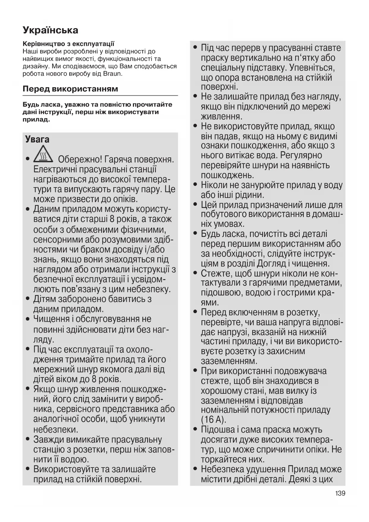 Обережно! Гаряча поверхня. Електричні прасувальні станції нагріваються до високої темпера- тури та випускають гарячу пару. Це може призвести до опіків.