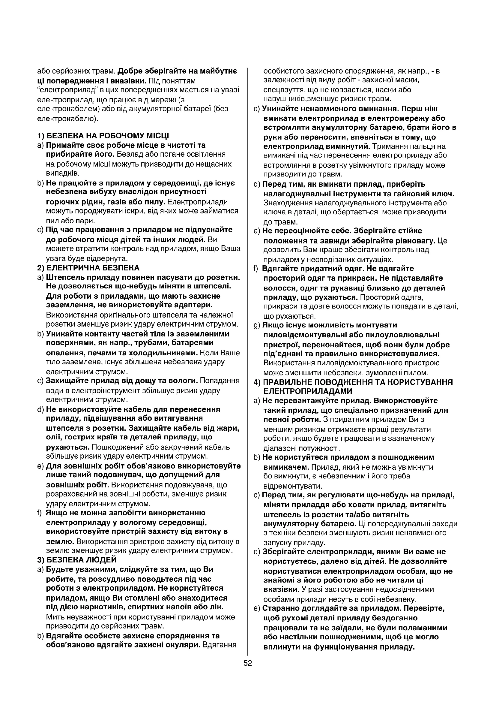 ЗАГАЛЬНІВКАЗІВКИЗТЕХНІКИ БЕЗПЕКИ УВАГА!Прочитайтевсіпопередженняівказівки. Недодержання попереджень і вказівок може призводити до удару електричним струмом, пожежі та/52 або серйозних травм. Добрезберігайтенамайбутнє ціпопередженняівказівки. Під поняттям “електроприлад” в цих попередженнях мається на увазі електроприлад, що працює від мережі (з електрокабелем) або від акумуляторної батареї (без електрокабелю). 1)БЕЗПЕКАНАРОБОЧОМУ МІСЦІ a) Примайтесвоєробочемісцевчистотіта прибирайтейого.Безлад або погане освітлення на робочому місці можуть призводити до нещасних