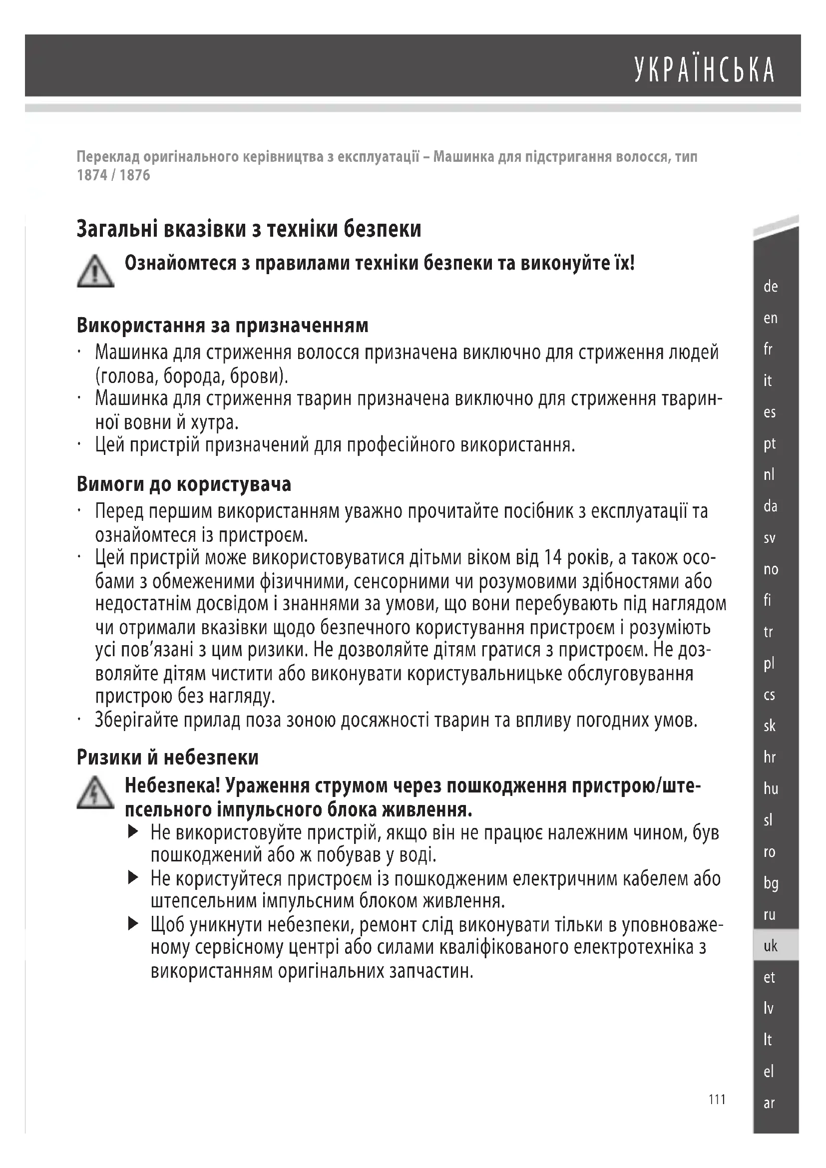 - Зберігайте прилад поза зоною досяжності тварин та впливу погодних умов. Ризики й небезпеки Небезпека! Ураження струмом через пошкодження пристрою/ште- псельного імпульсного блока живлення. f Не використовуйте пристрій, якщо він не працює належним чином, був пошкоджений або ж побував у воді. f Не користуйтеся пристроє м із пошкодженим електричним кабелем або штепсельним імпульсним блоком живлення. f Щоб уникнути небезпеки, ремонт слід виконувати тільки в уповноваже- ному сервісному центрі або силами кваліфікованого електротехніка з використанням оригінальних запчастин. Переклад оригінального керівництва з експлуатації – Mашинка для підстригання волосся, тип 1874 / 1876112