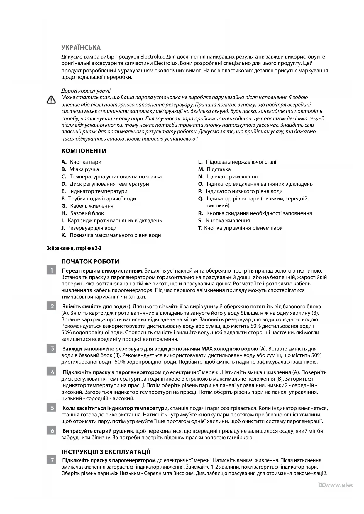 Дякуємо вам за вибір продукції Electrolux. Для досягнення найкращих результатів завжди використовуйте оригінальні аксесуари та запчастини Electrolux. Вони розроблені спеціально для цього продукту. Цей продукт розроблений з урахуванням екологічних вимог. На всіх пластикових деталях присутнє маркування щодо подальшої переробки. Дорогі користувачі! Може статись так, що Ваша парова установка не виробляє пару негайно після наповнення її водою вперше або після повторного наповнення резервуару. Причина полягає в тому, що повітря всередині системи може спричиняти затримку цієї функції на декілька секунд. Будь ласка, зачекайте та повторіть спробу, натиснувши кнопку пари. Для зручності пара продовжить виходити ще протягом декілька секунд після відпускання кнопки, тому немає потреби тримати кнопку натиснутою увесь час. Знайдіть свій власний ритм для оптимального результату роботи. Дякуємо за те, що приділили увагу, та бажаємо насолоджуватись вашою новою паровою установкою !