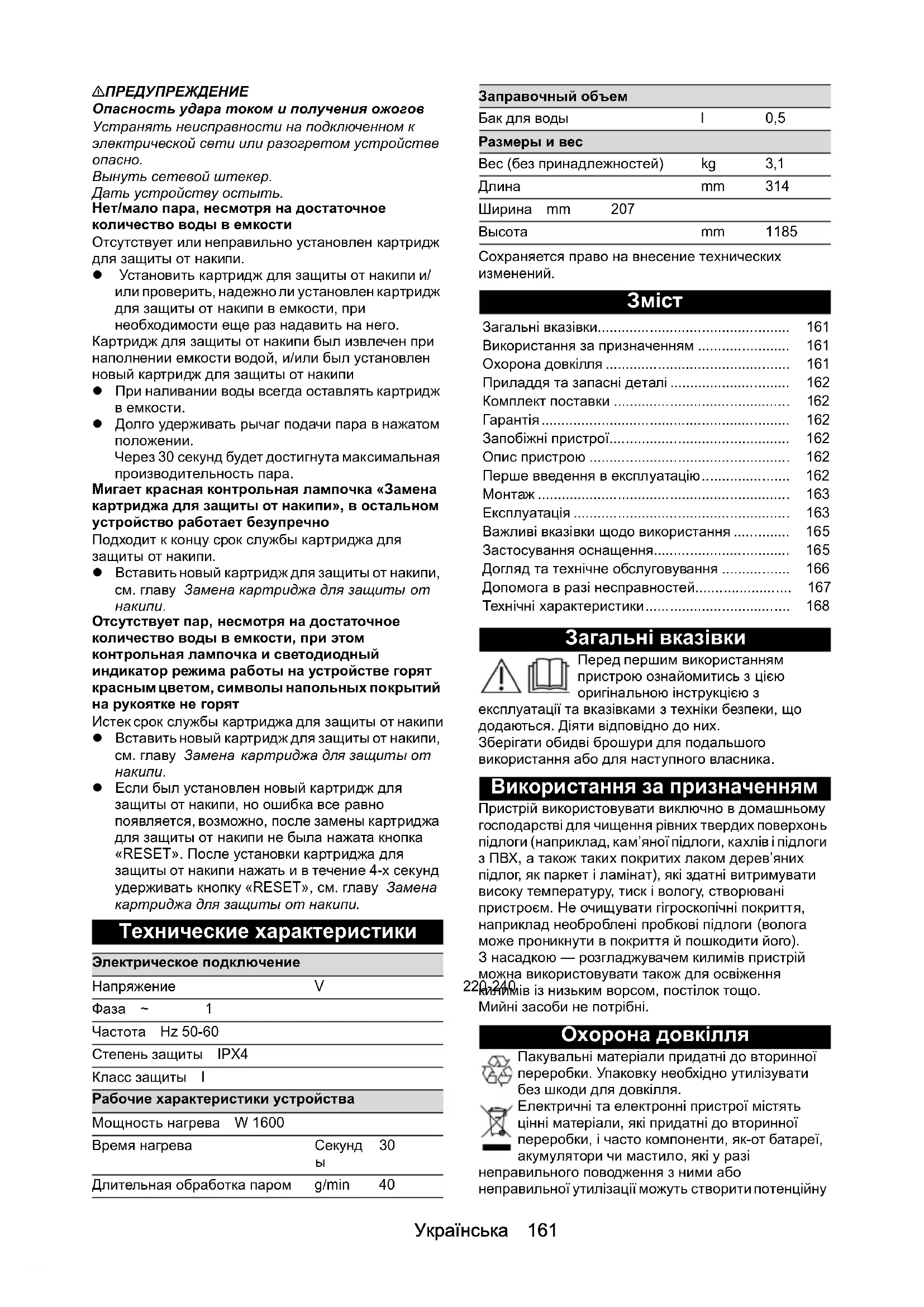 Загальні вказівки Перед першим використанням пристрою ознайомитись з цією оригінальною інструкцією з експлуатації та вказівками з техніки безпеки, що додаються. Діяти відповідно до них. Зберігати обидві брошури для подальшого використання або для наступного власника. Використання за призначенням Пристрій використовувати виключно в домашньому господарстві для чищення рівних твердих поверхонь підлоги (наприклад, кам’яної підлоги, кахлів і підлоги з ПВХ, а також таких покритих лаком дерев’яних підлог, як паркет і ламінат), які здатні витримувати високу температуру, тиск і вологу, створювані пристроєм. Не очищувати гігроскопічні покриття, наприклад необроблені пробкові підлоги