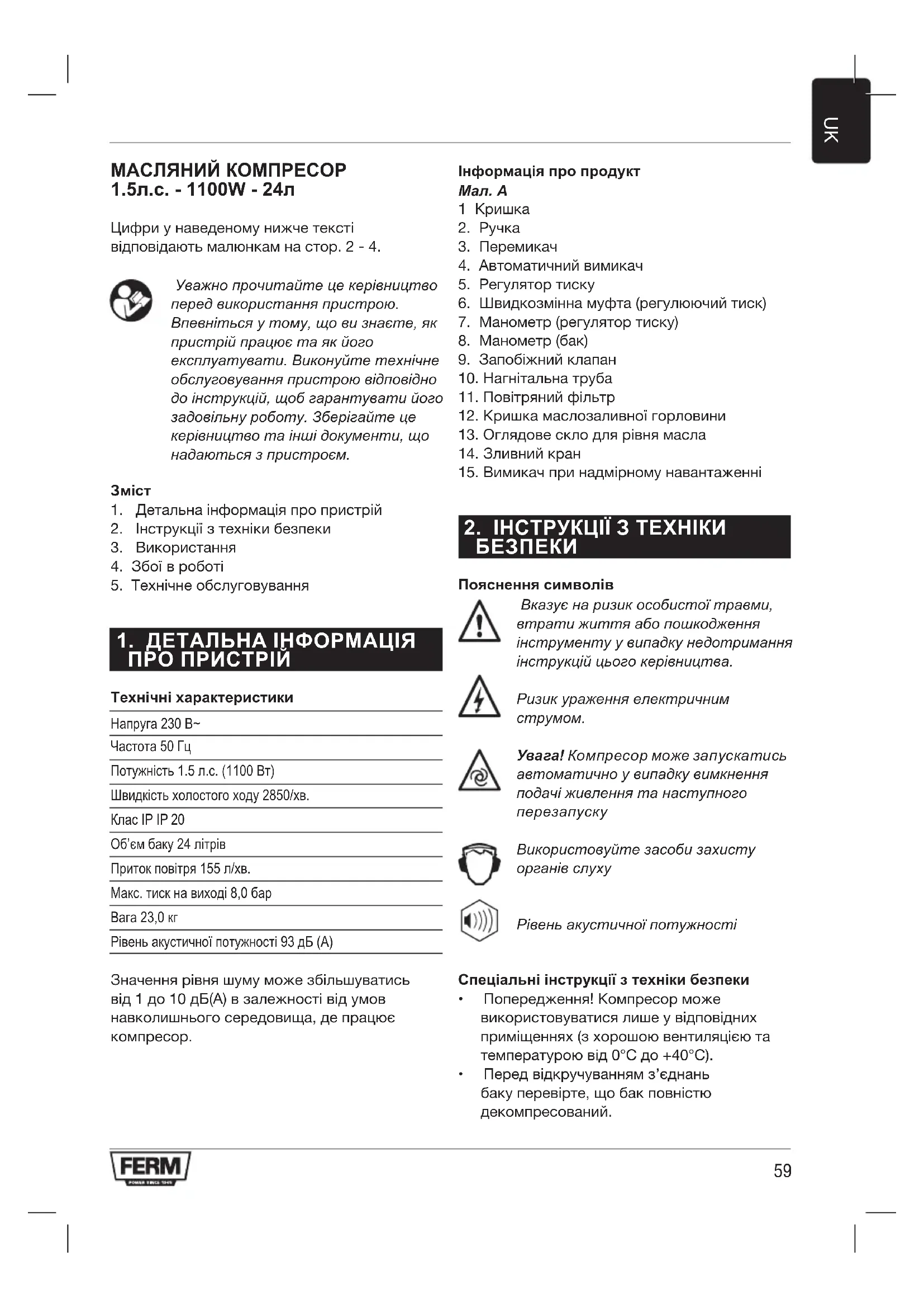 ПРО ПРИСТРІЙ Технічні характеристики Напруга 230 В~ Частота 50 Гц Потужність 1.5 л.с. (1100 Вт) Швидкість холостого ходу 2850/хв. Клас IP IP 20 Об’єм баку 24 літрів Приток повітря 155 л/хв. Макс. тиск на виході 8,0 бар Вага 23,0 кг Рівень акустичної потужності 93 дБ (A) Значення рівня шуму може збільшуватись від 1 до 10 дБ(A) в залежності від умов навколишнього середовища, де працює