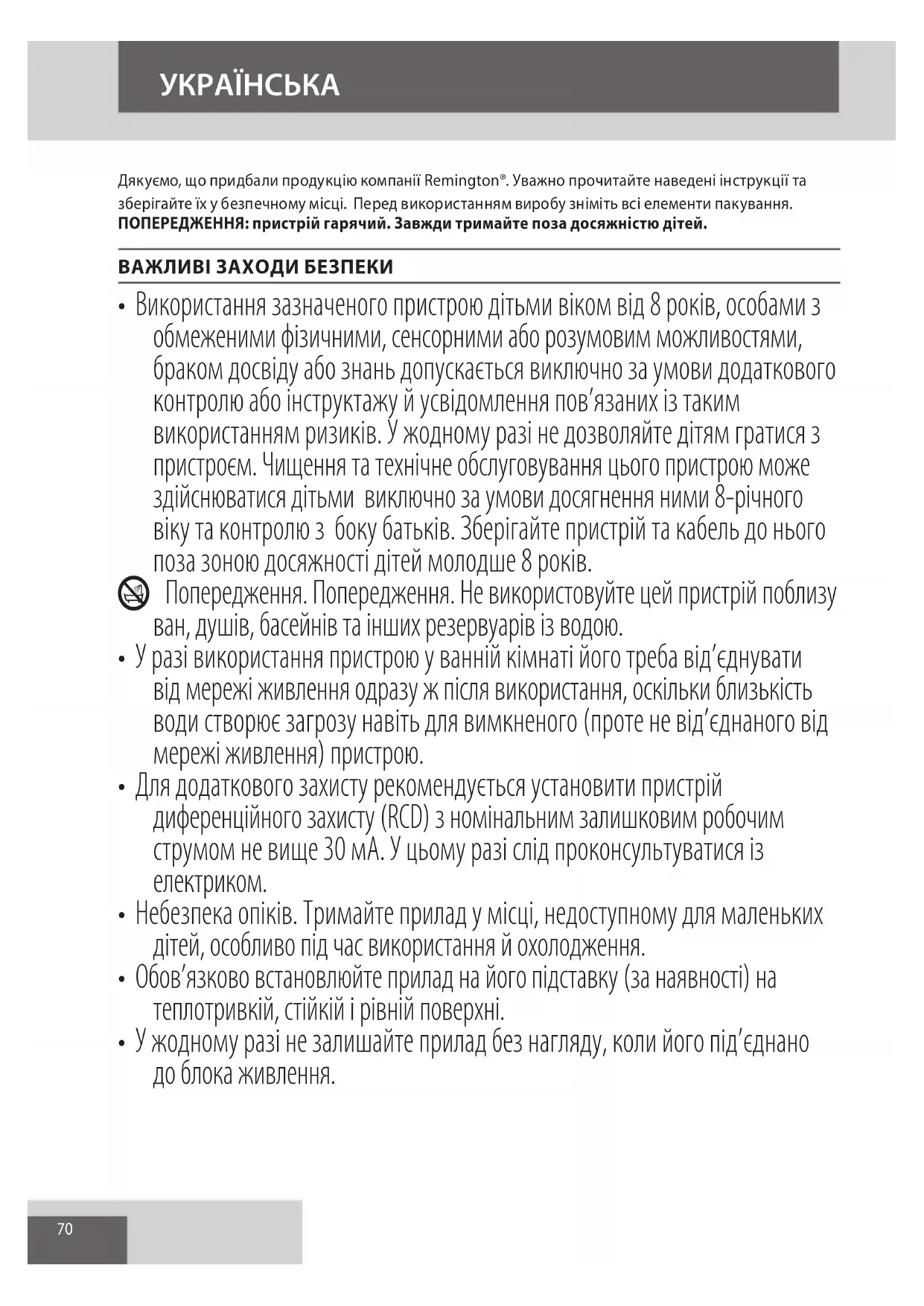 Kako bi se izbjegle štetne posljedice na okoliš i zdravlje zbog opasnih supstanci, uređaji i punjive i nepunjive baterije obilježene jednim od ovih simbola ne smiju se zbrinjavati kao nerazvrstani komunalni otpad. Uvijek odložite električne i elektroničke proizvode i , gdje je primjenljivo, punjive i nepunjive baterije, u odgovarajućem zvaničnom mjestu za sakupljanje/reciklažu.70 Дякуємо, що придбали продукцію компанії Remington®. Уважно прочитайте наведені інструкції та зберігайте їх у безпечному місці. Перед використанням виробу зніміть всі елементи пакування. ПОПЕРЕДЖЕННЯ: пристрій гарячий. Завжди тримайте поза досяжністю дітей. ВАЖЛИВІ ЗАХОДИ БЕЗПЕКИ