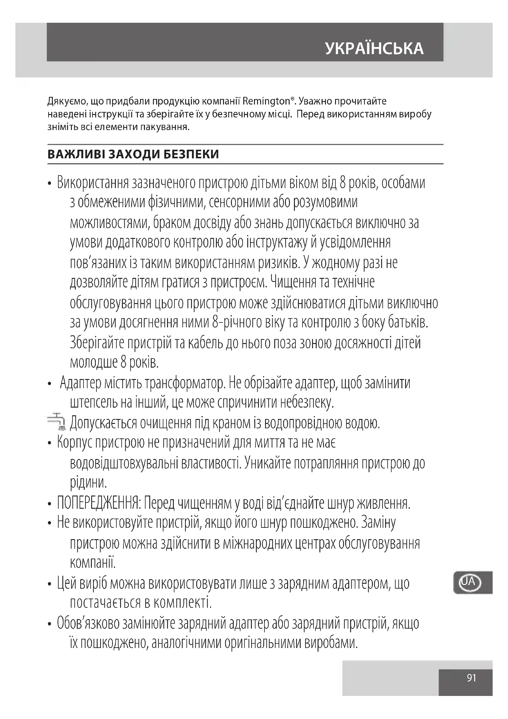 - Використання зазначеного пристрою дітьми віком від 8 років, особами з обмеженими фізичними, сенсорними або розумовими можливостями, браком досвіду або знань допускається виключно за умови додаткового контролю або інструктажу й усвідомлення пов’язаних із таким використанням ризиків. У жодному разі не дозволяйте дітям гратися з пристроєм. Чищення та технічне обслуговування цього пристрою може здійснюватися дітьми виключно за умови досягнення ними 8-річного віку та контролю з боку батьків. Зберігайте пристрій та кабель до нього поза зоною досяжності дітей молодше 8 років.